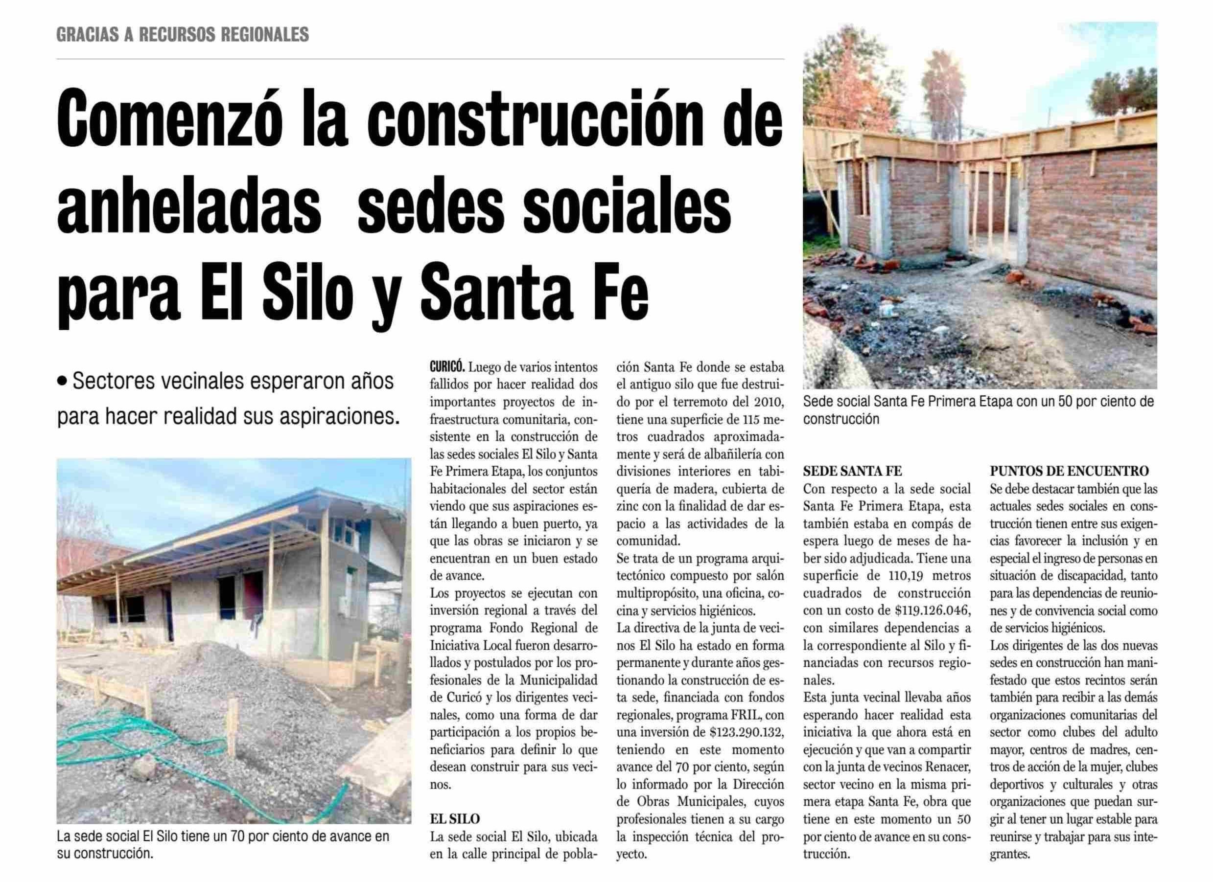 Comenzó la construcción de anheladas sedes sociales para El Silo y Santa Fe 26-05-2025 La Prensa de Curicó |