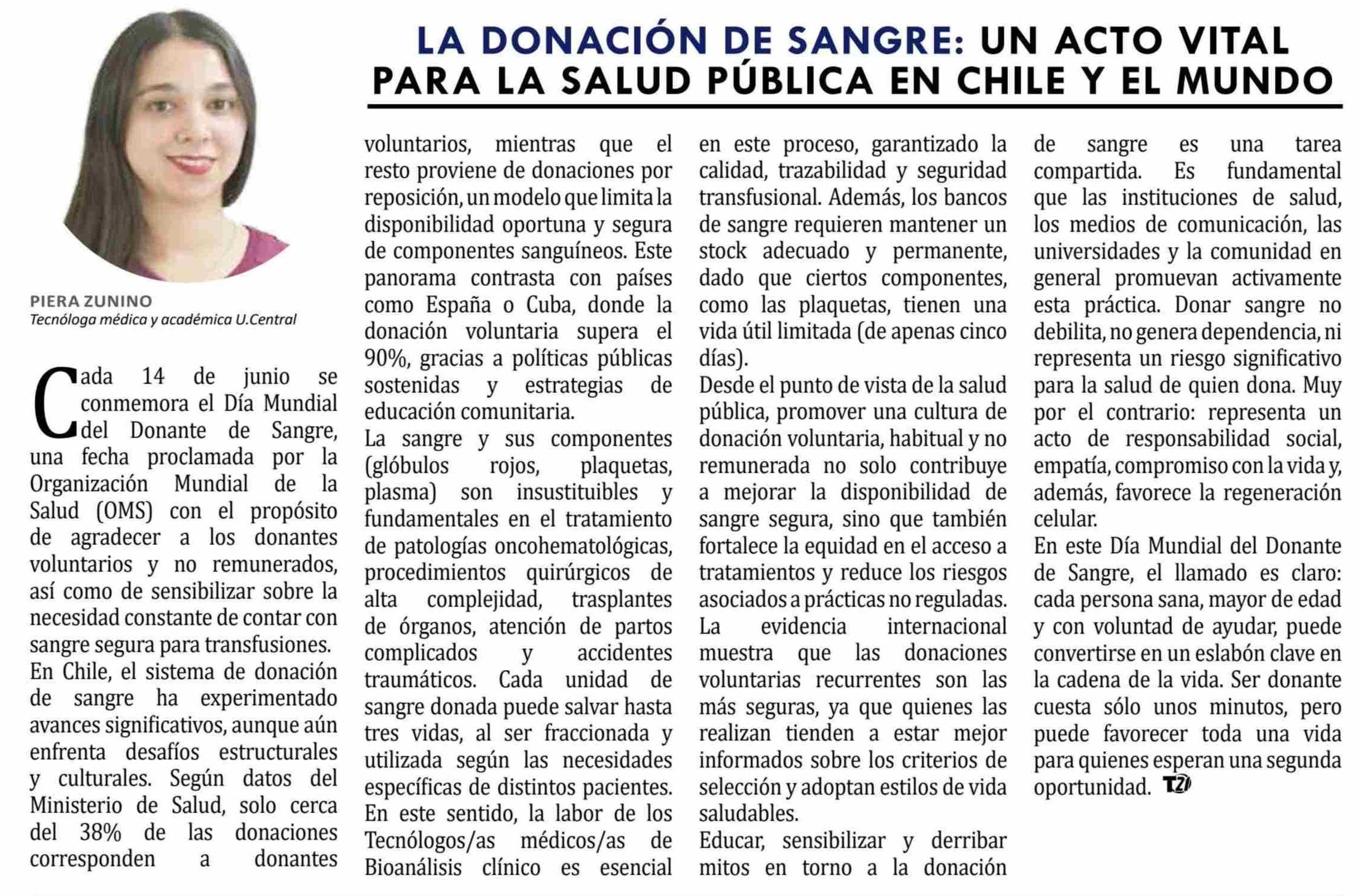 | Título: | COLUMNAS DE OPINIÓN: LA DONACIÓN DE SANGRE: UN ACTO VITAL PARA LA SALUD PÚBLICA EN CHILE Y EL MUNDO |