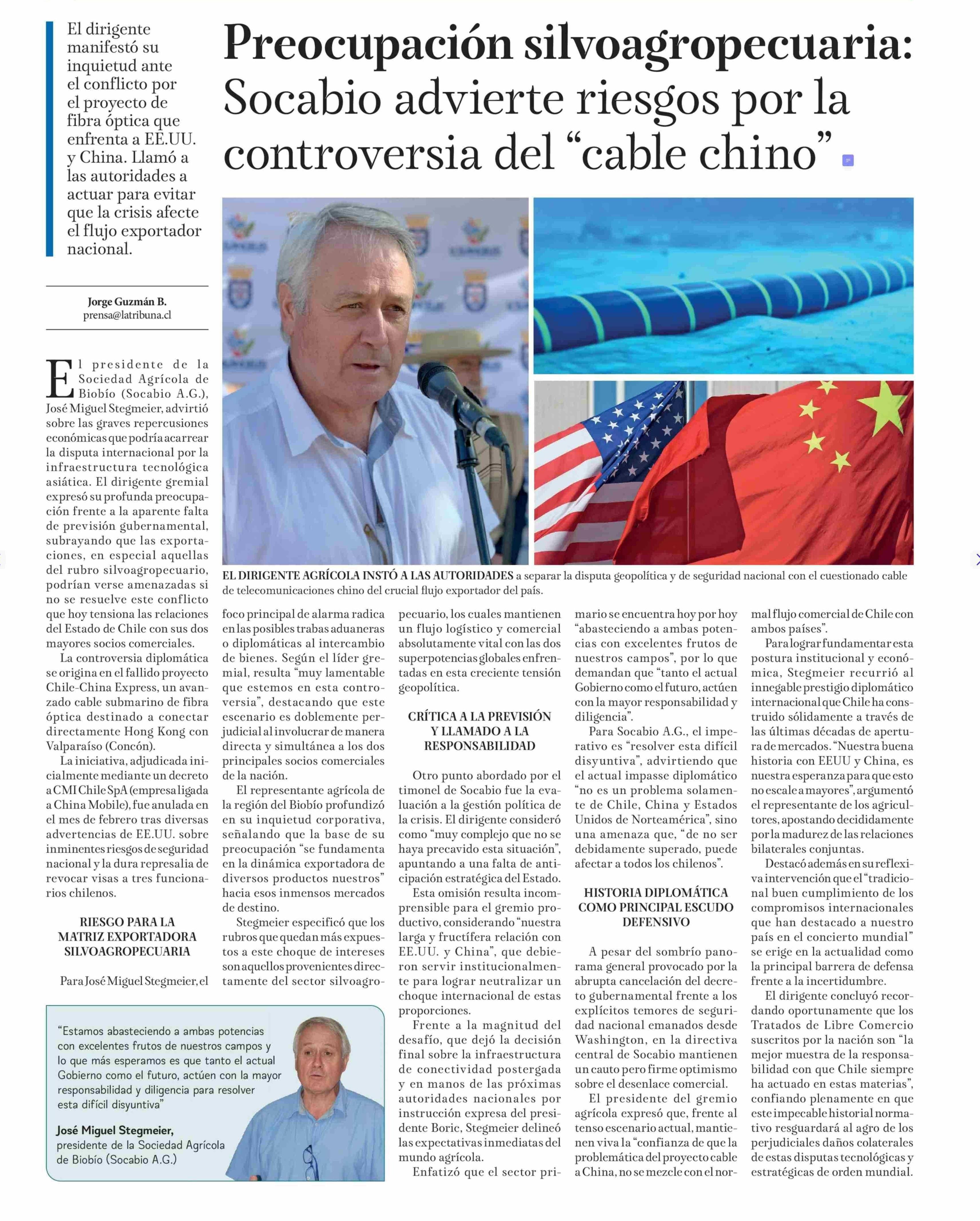 Título: Preocupación suyo agropecuaria: Socabio advierte riesgos por la controversia del cable chino