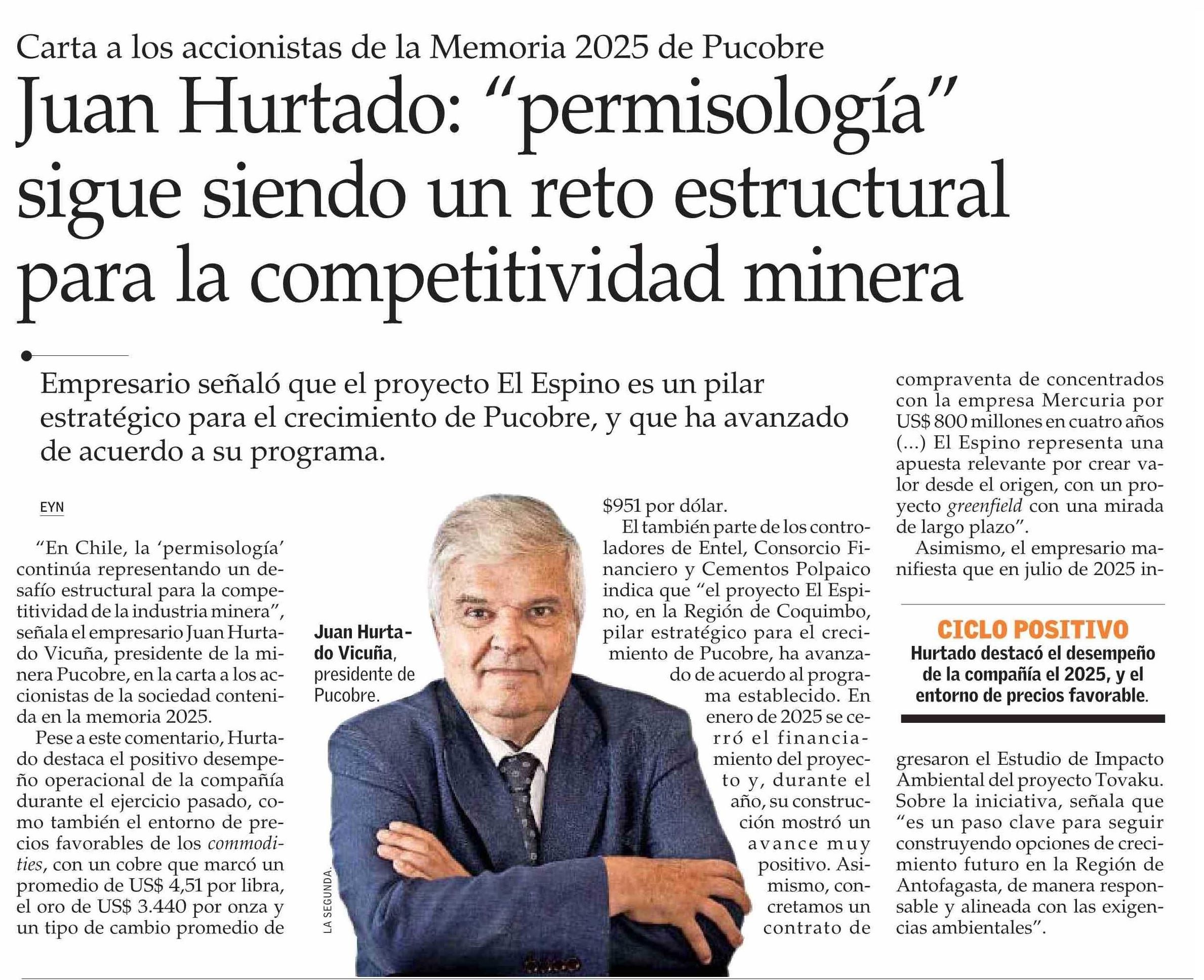 Juan Hurtado: "permisología" sigue siendo un reto estructural para la competitividad minera 09-04-2026 El Mercurio |