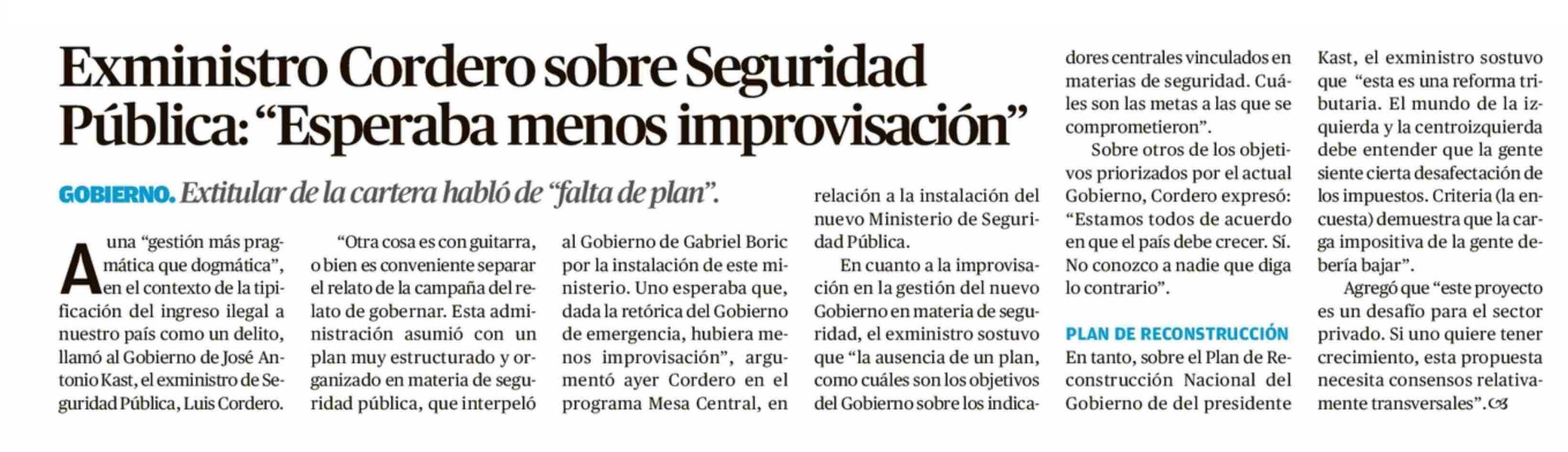 | Título: | Exministro Cordero sobre Seguridad Pública: "Esperaba menos improvisación" |