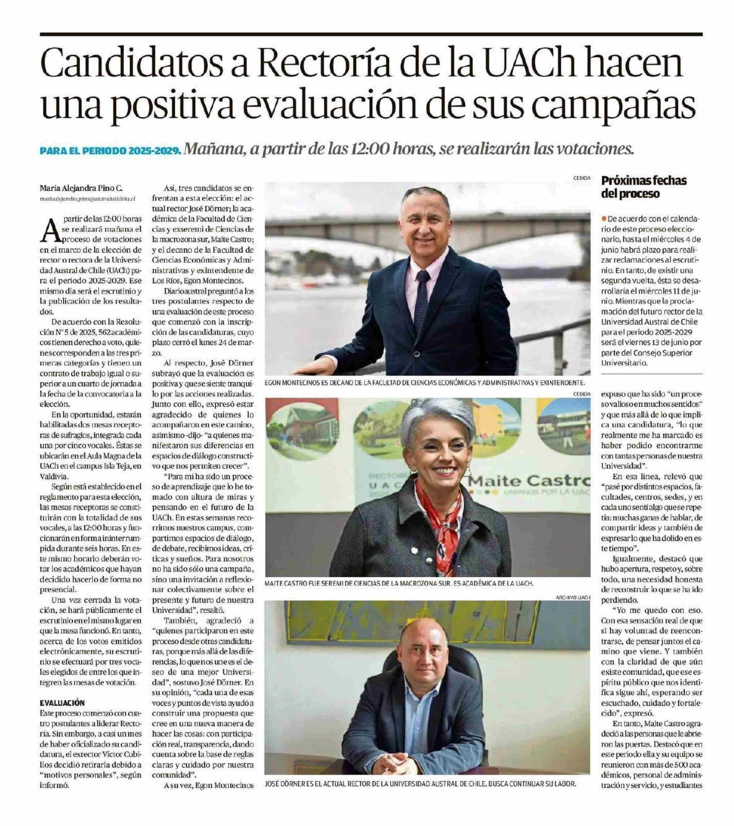 Candidatos a Rectoría de la UACh hacen una positiva evaluación de sus campañas 02-06-2025 Diario Austral Región de Los Ríos |
