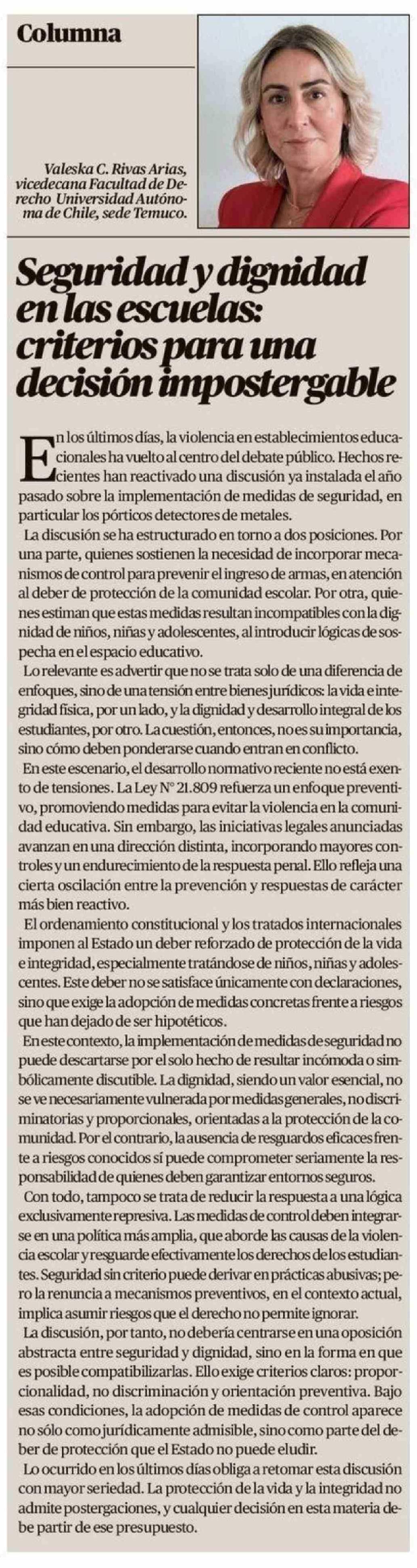 Columnas de Opinión: Seguridad y dignidad en las escuelas: criterios para una decisión impostergable 17-04-2026 El Austral de la Araucanía |