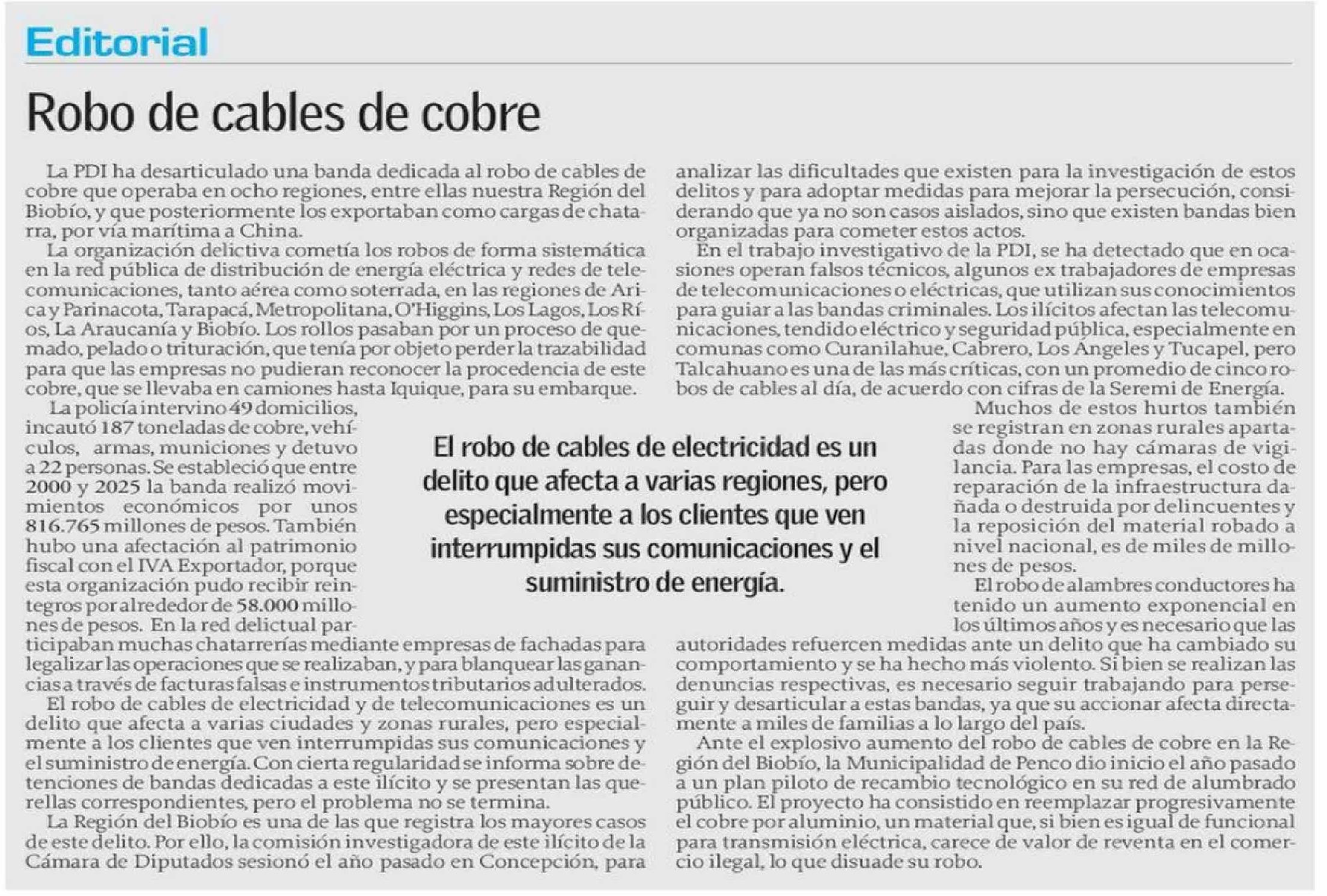 Editorial: Robo de cables de cobre 11-04-2026 El Sur |
