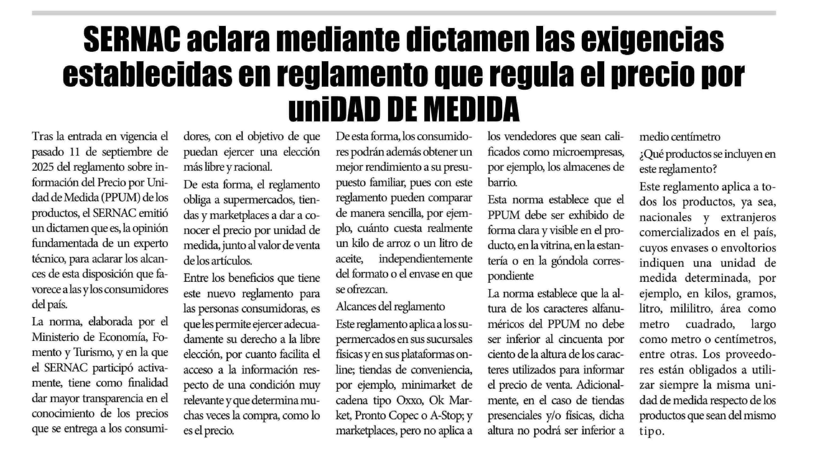 SERNAC aclara mediante dictamen las exigencias establecitdas en reglamento que regula el precio por uniDAD DE MEDIDA 24-02-2026 El Lector |