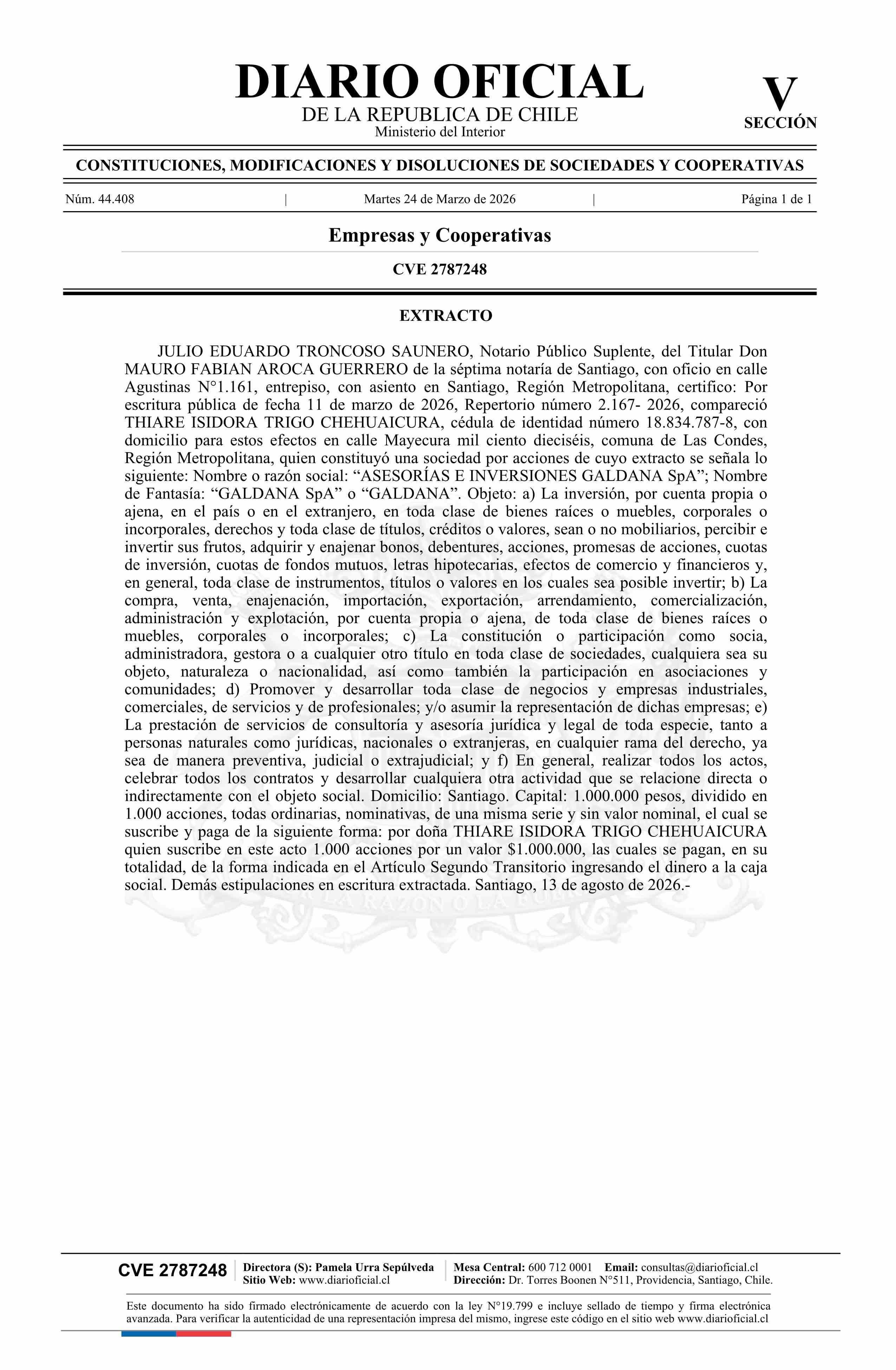 ASESORÍAS E INVERSIONES GALDANA SpA 24-03-2026 Diario Oficial Edición Electrónica |
