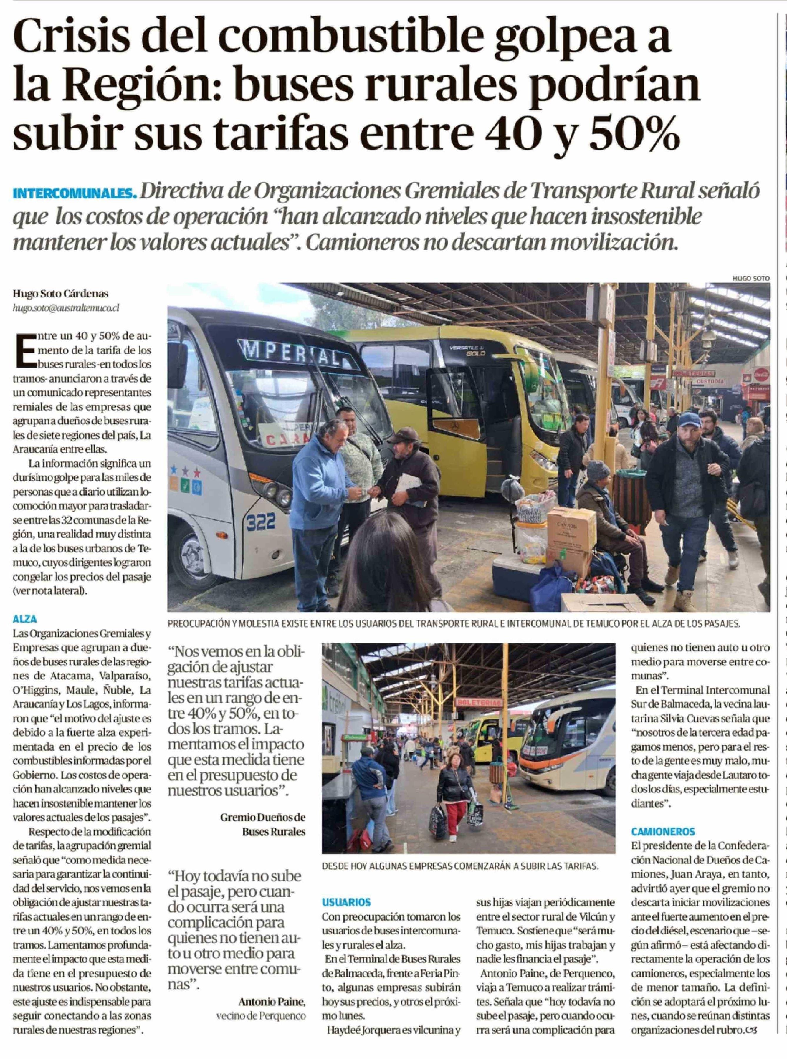 Título: Crisis del combustible golpea a la Región: buses rurales podrían subir sus tarifas entre 40 y 50%