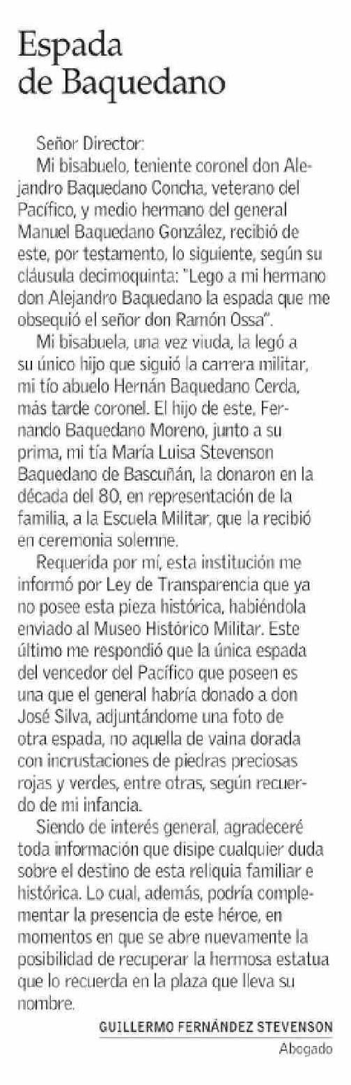 CARTAS: Espada de Baquedano 07-06-2025 El Mercurio |