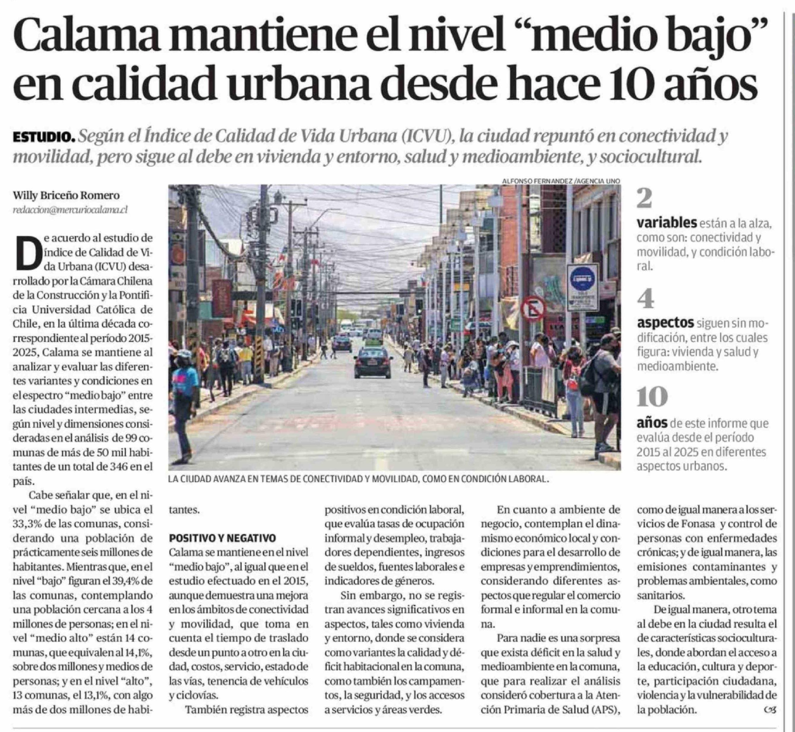 Título: Calama mantiene el nivel "medio bajo" en calidad urbana desde hace 10 años