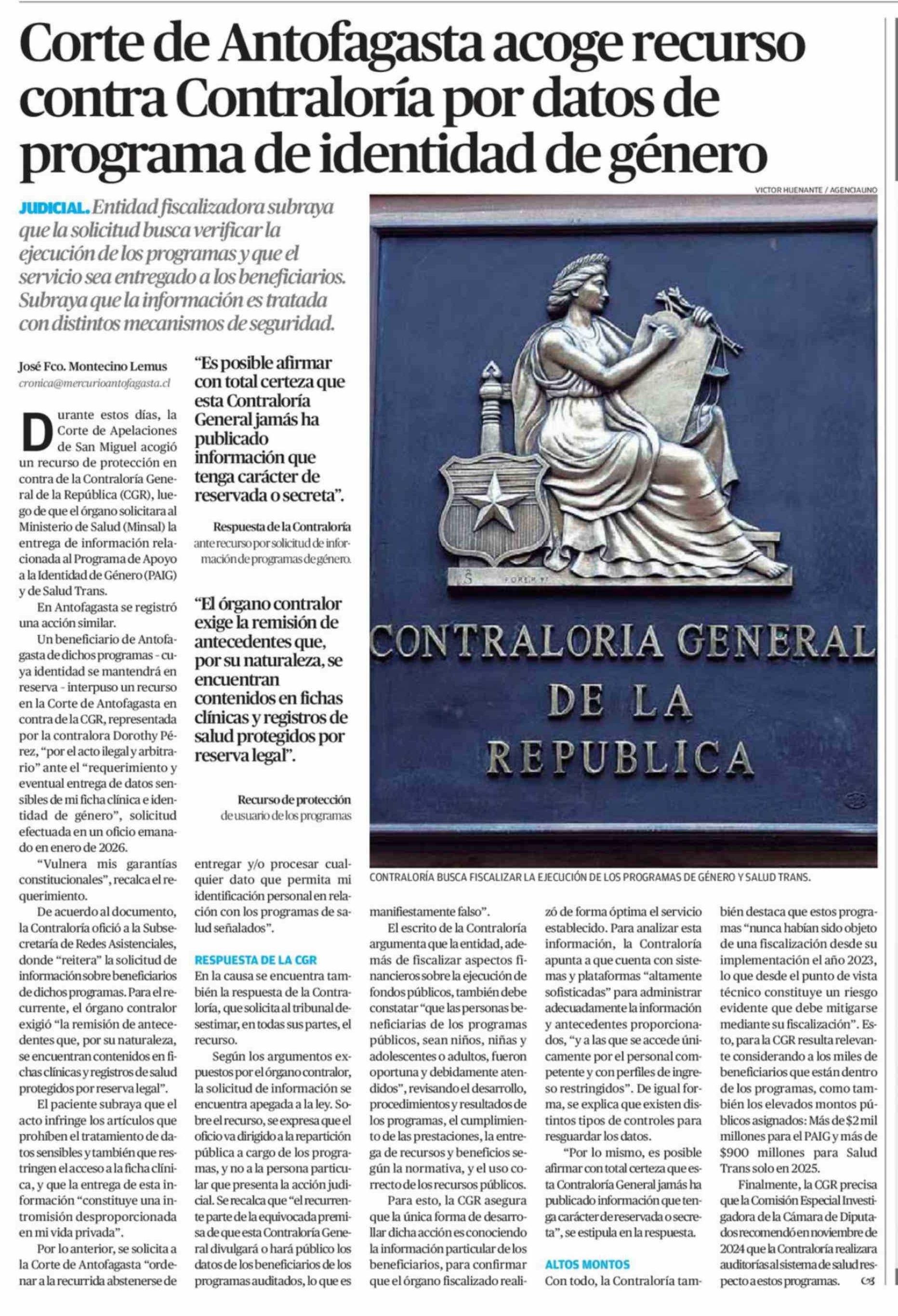 Corte de Antofagasta acoge recurso contra Contraloría por datos de programa de identidad de género 12-02-2026 El Mercurio de Calama |