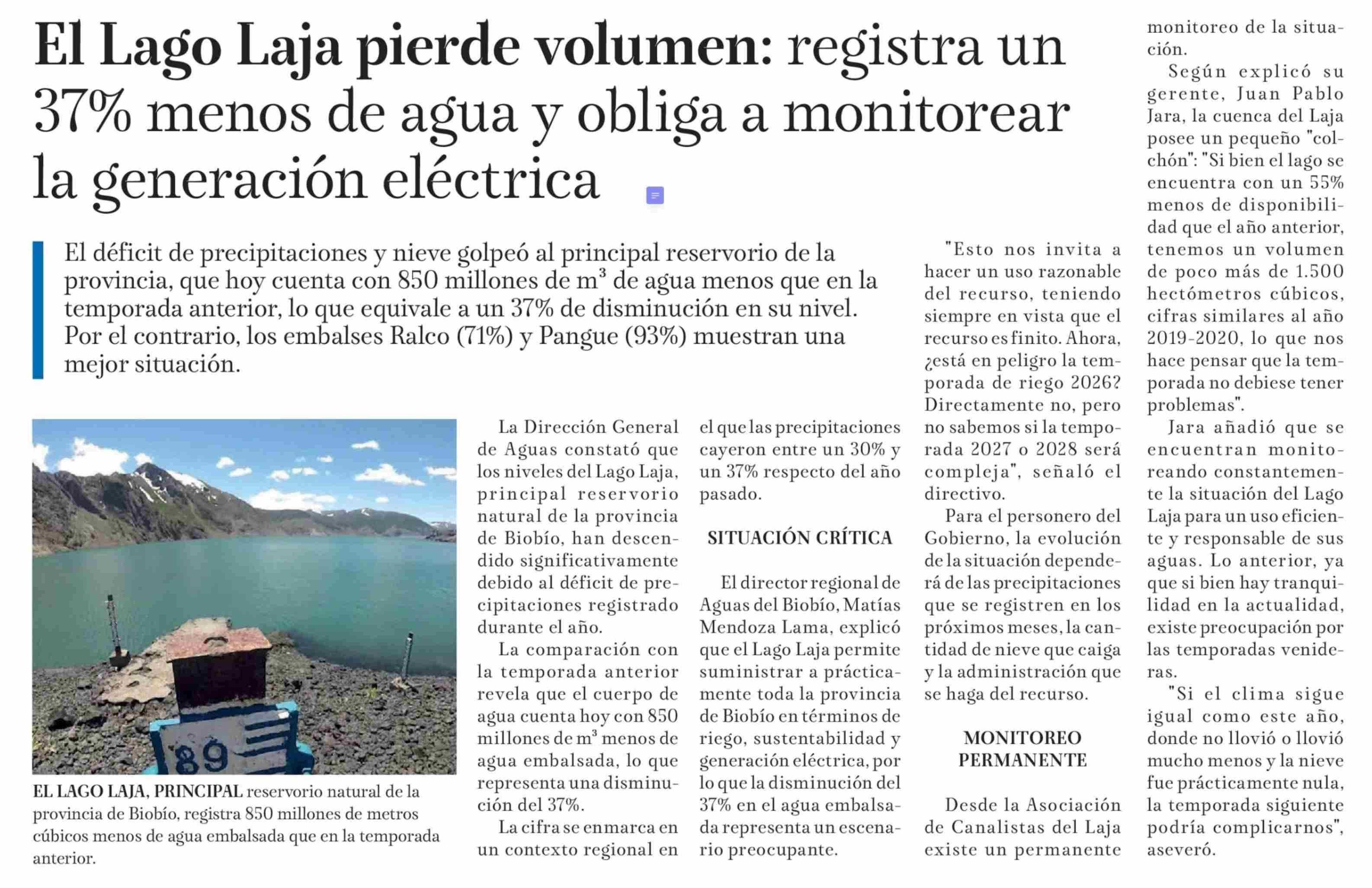 Título: El Lago Laja pierde volumen: registra un 37% menos de agua y obliga a monitorear la generación eléctrica