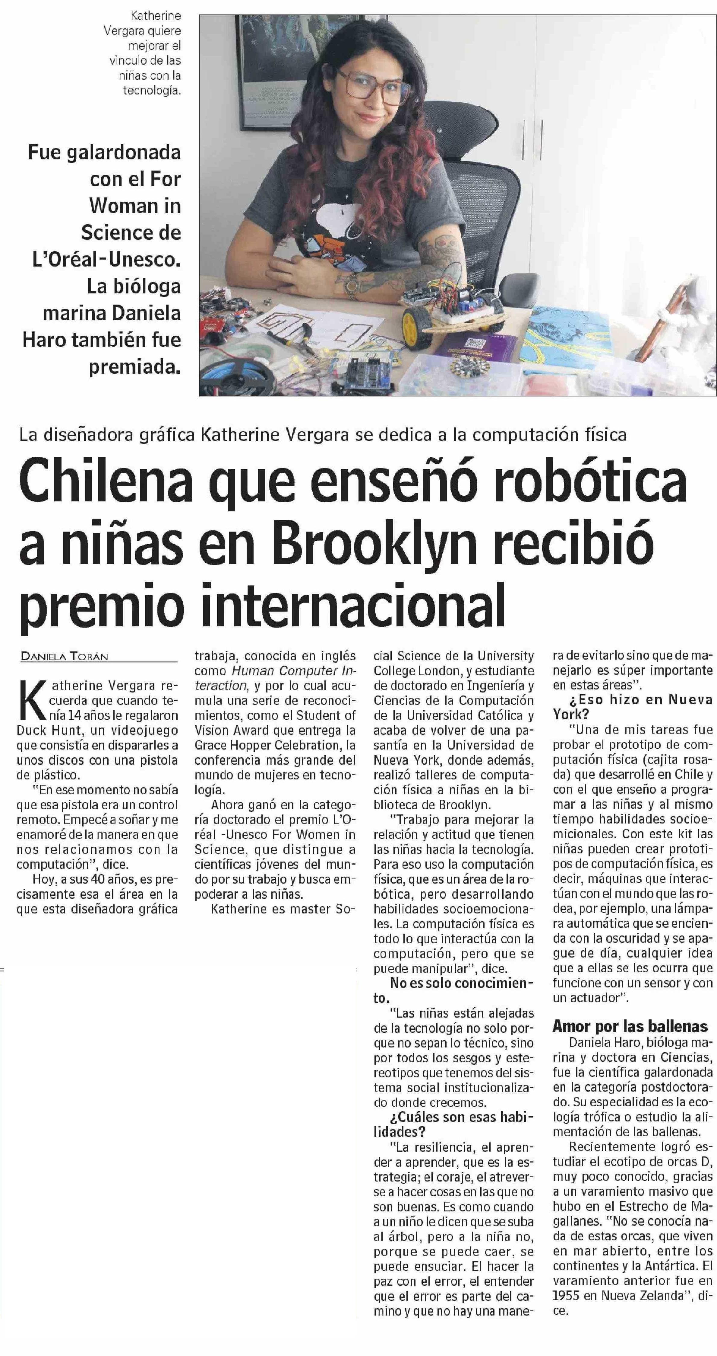 Chilena que enseñó robótica a niñas en Brooklyn recibió premio internacional 15-11-2023 Las Últimas Noticias |