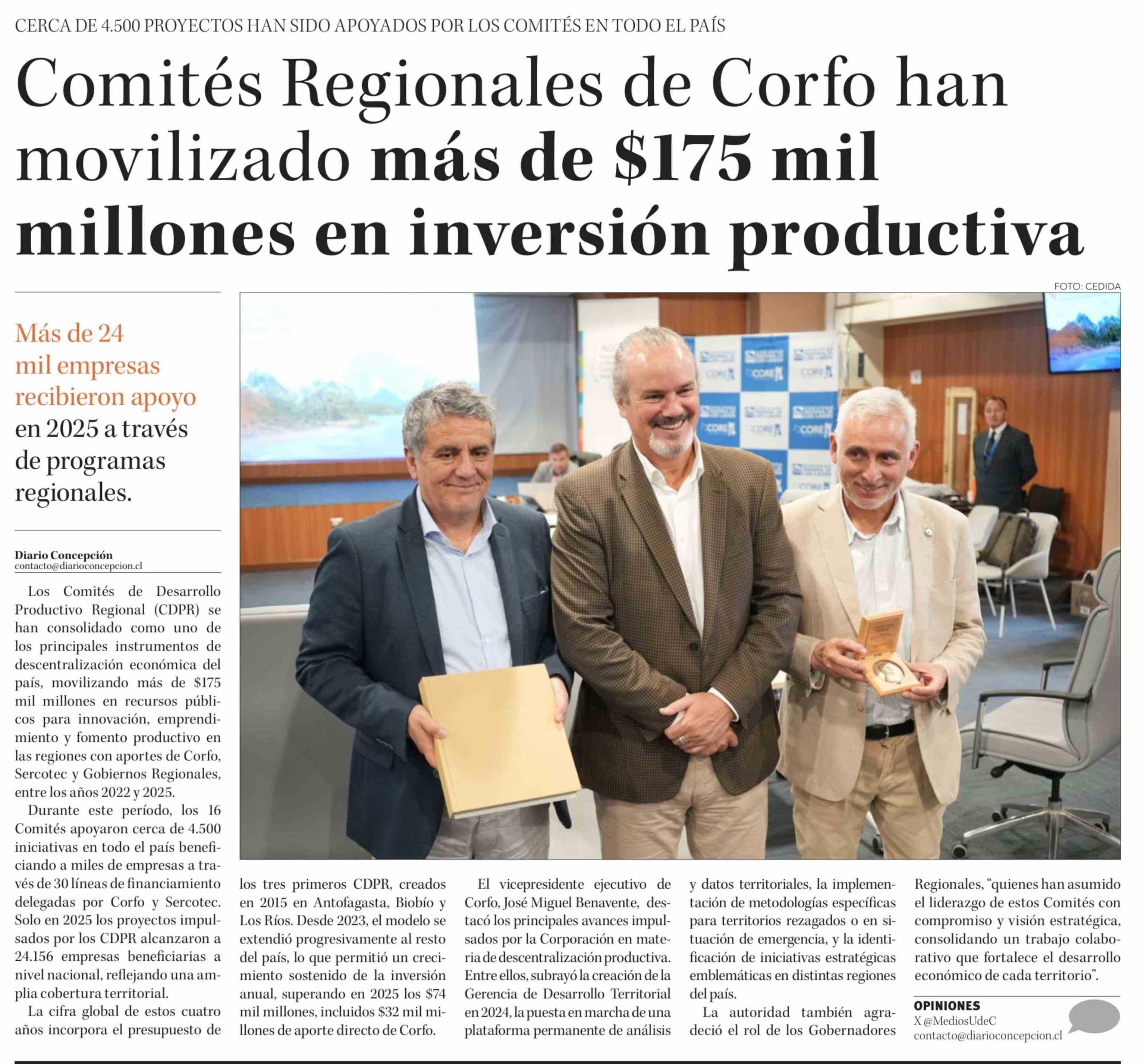 Comités Regionales de Corfo han movilizado más de $175 mil millones en inversión productiva 08-03-2026 Diario Concepción |