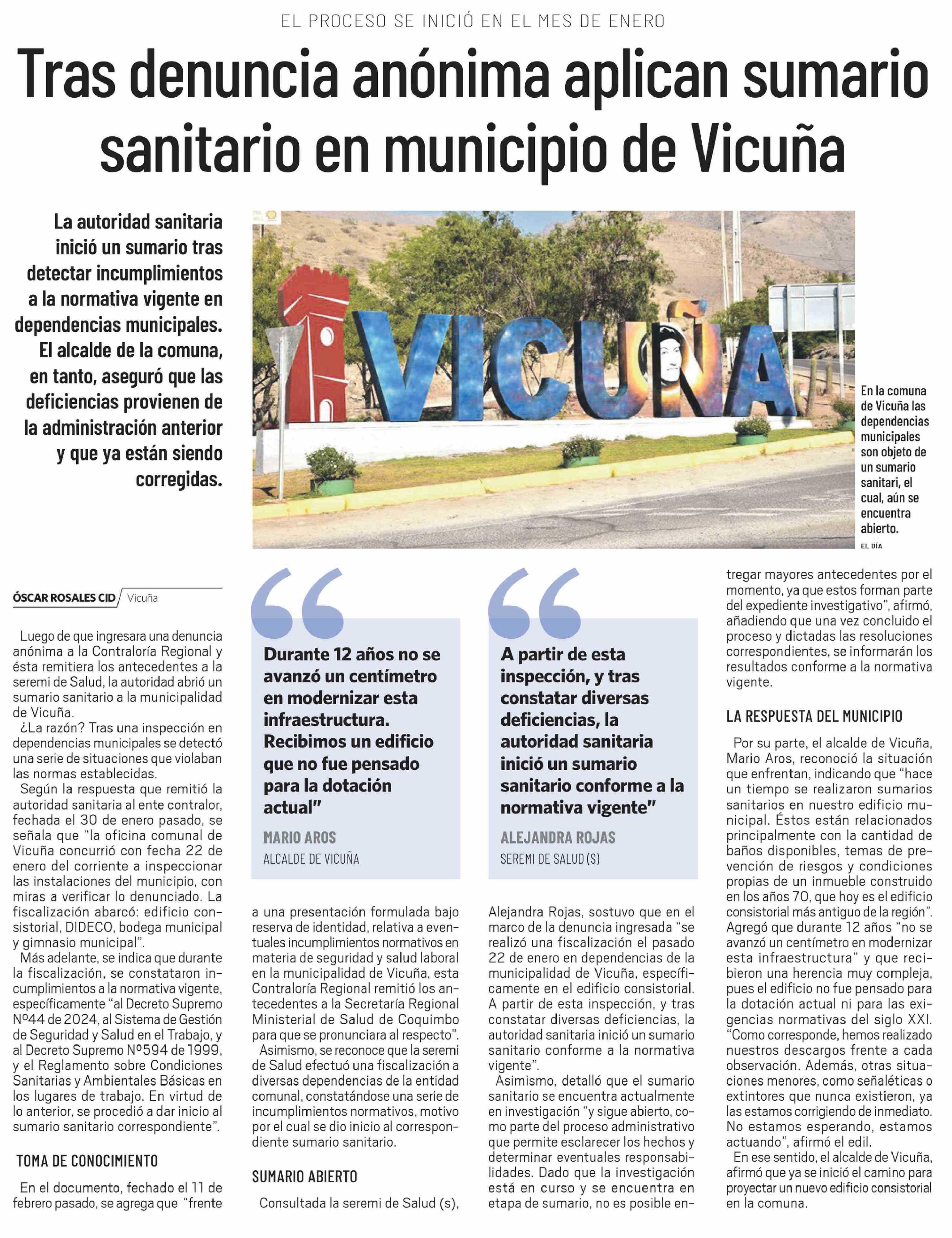 Tras denuncia anónima aplican sumario sanitario en municipio de Vicuña 13-02-2026 El Día |