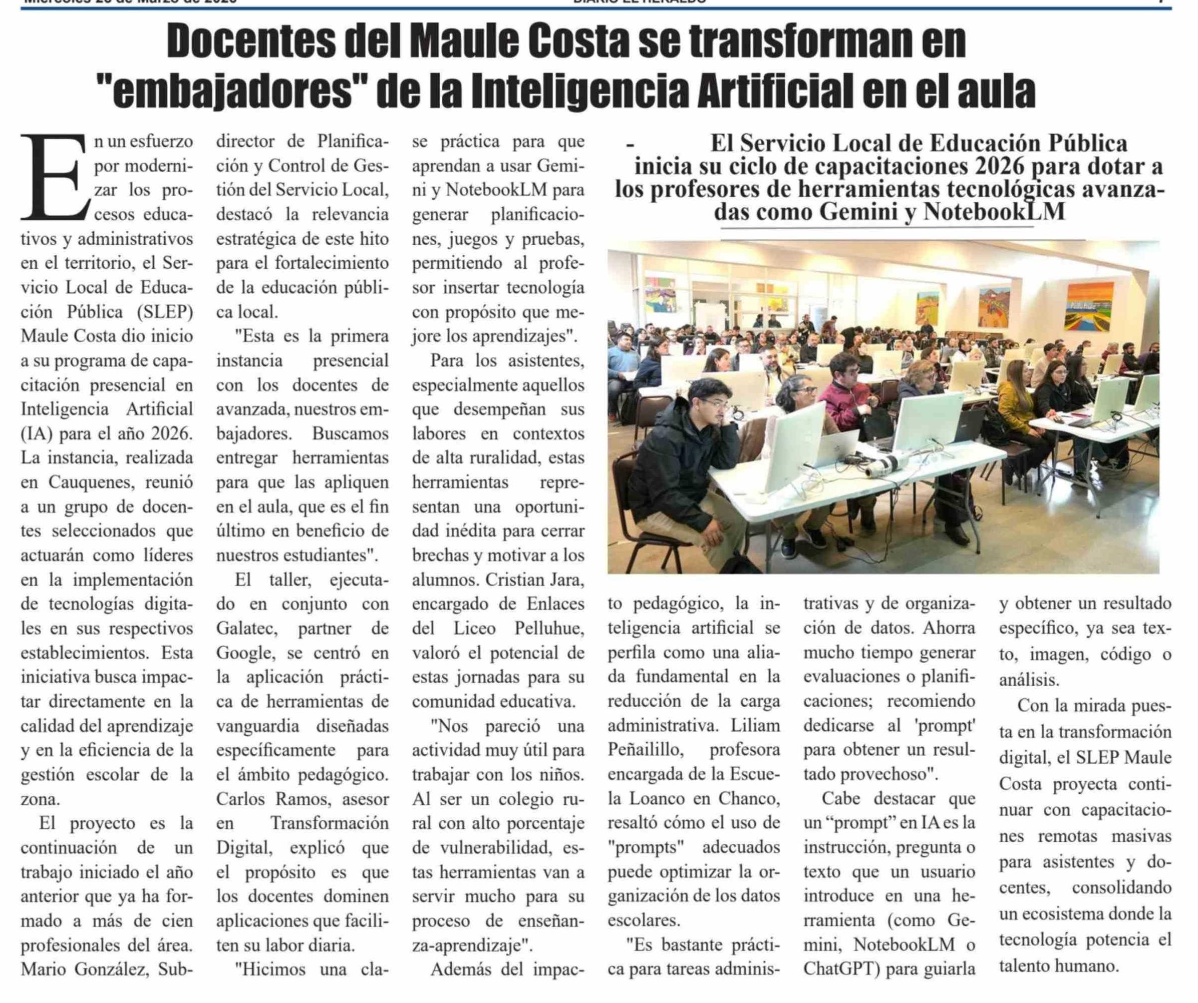 Docentes del Maule Costa se transforman en "embajadores" de la Inteligencia Artificial en el aula 25-03-2026 El Heraldo |