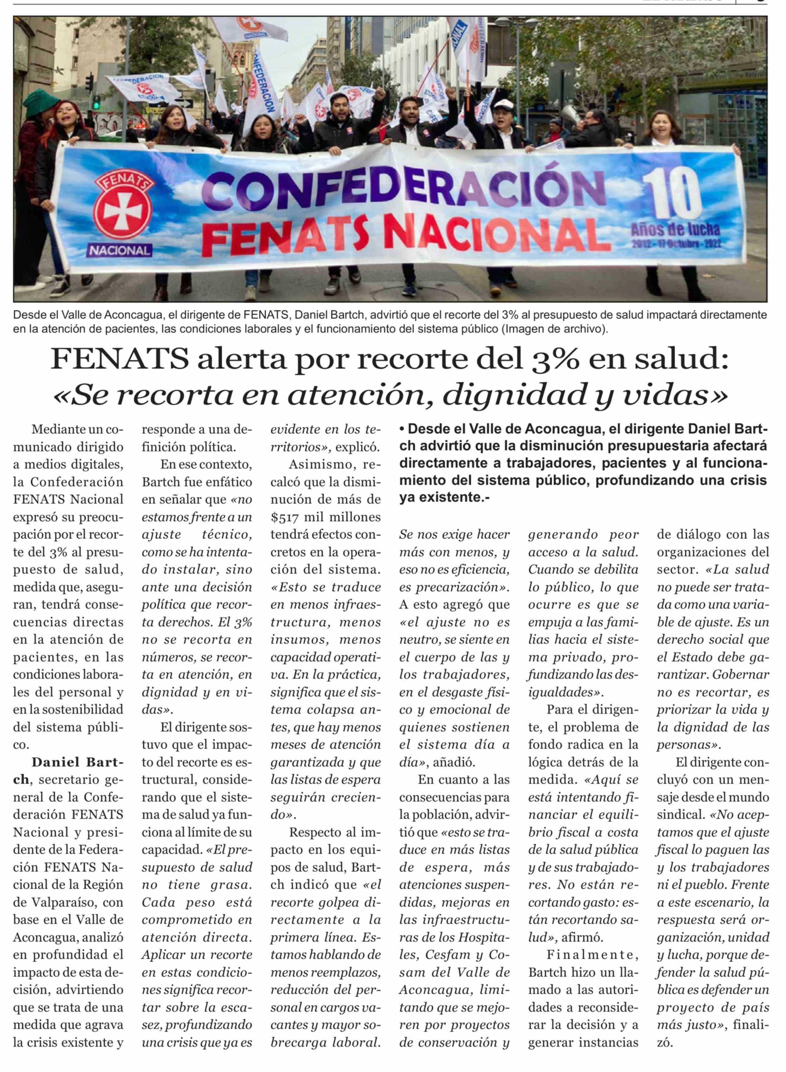 Título: FENATS alerta por recorte del 3% en salud: «Se recorta en atención, dignidad y vidas»