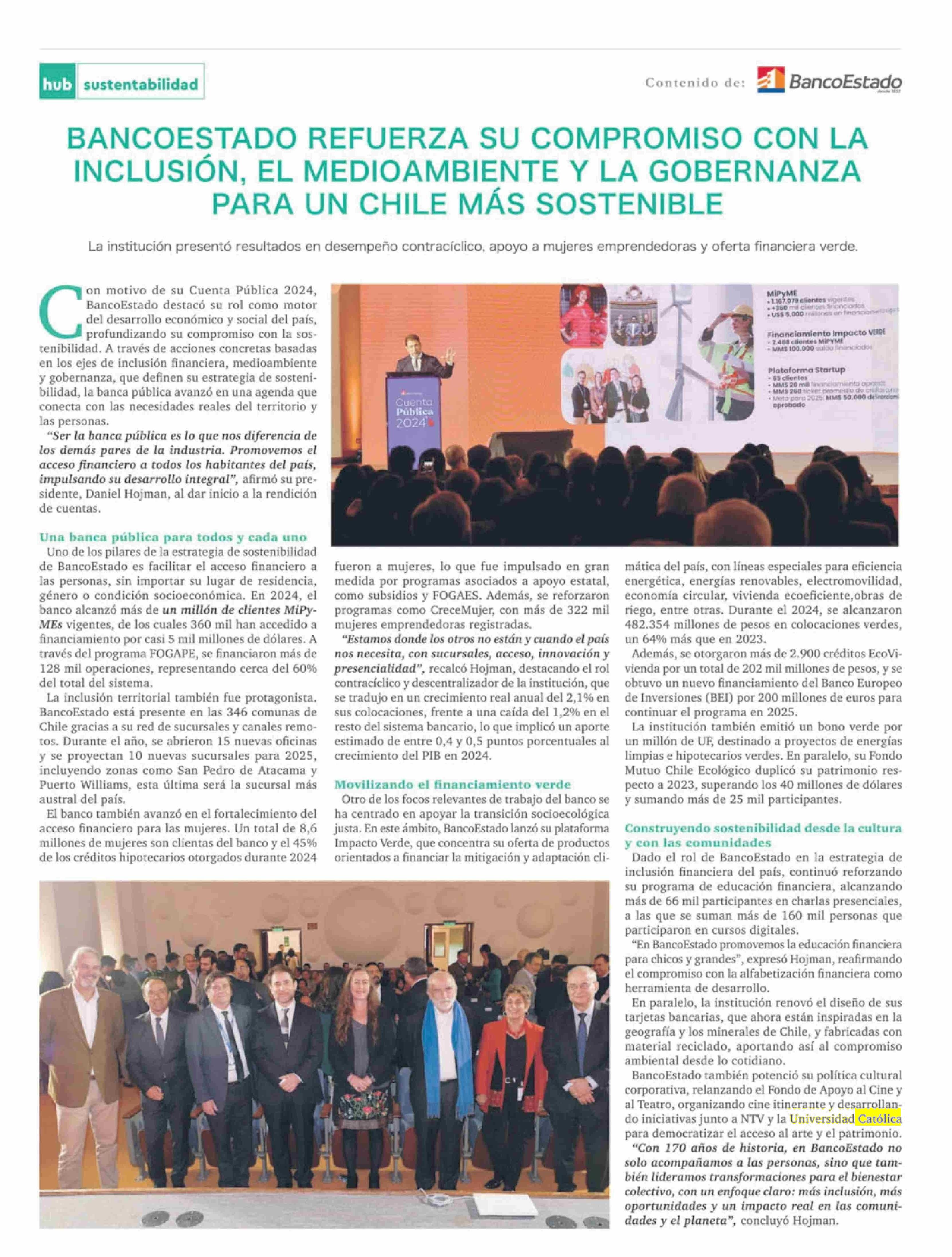 BANCOESTADO REFUERZA SU COMPROMISO CON LA INCLUSIÓN, EL MEDIOAMBIENTE Y LA GOBERNANZA PARA UN CHILE MÁS SOSTENIBLE 19-04-2025 La Tercera |