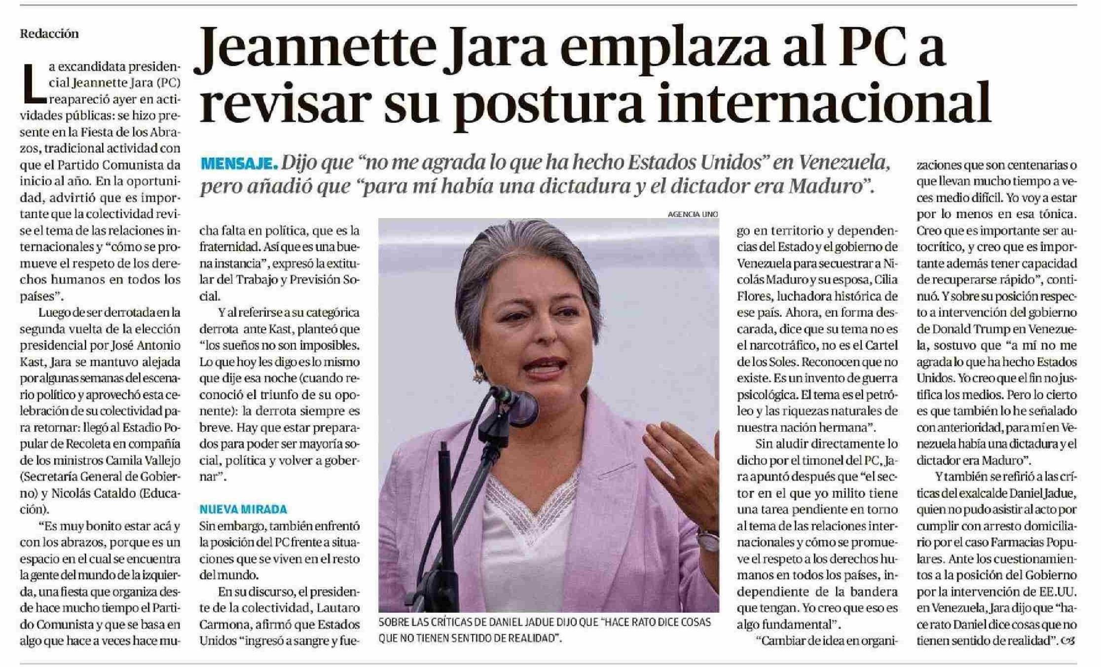 Título: Jeannette Jara emplaza al PC a revisar su postura internacional