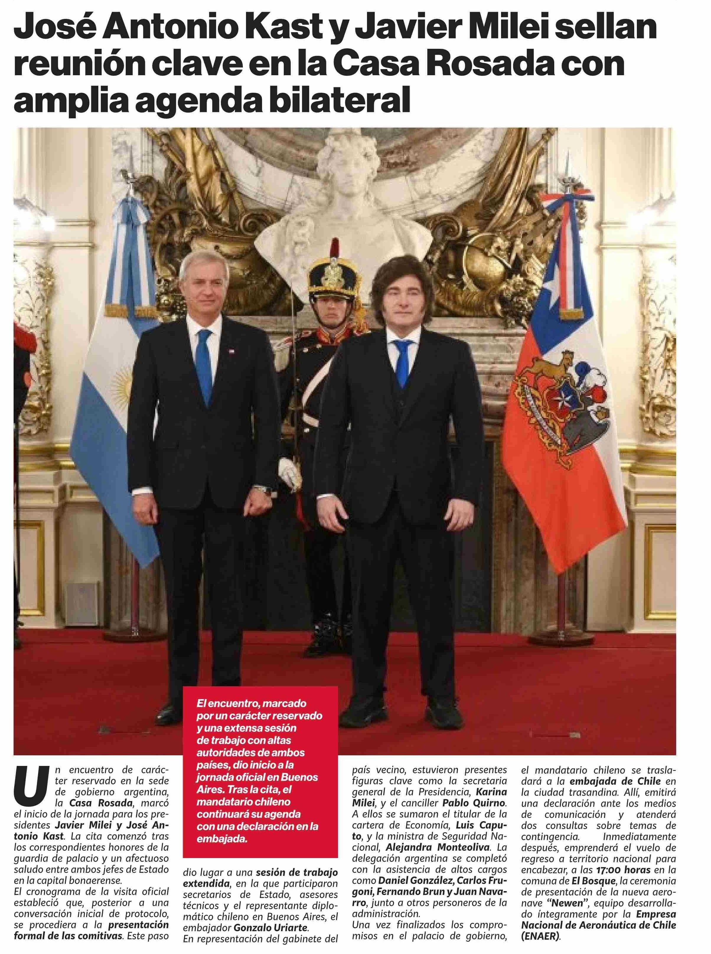 | Título: | José Antonio Kast y Javier Milei sellan reunión clave en la Casa Rosada con amplia agenda bilateral |
