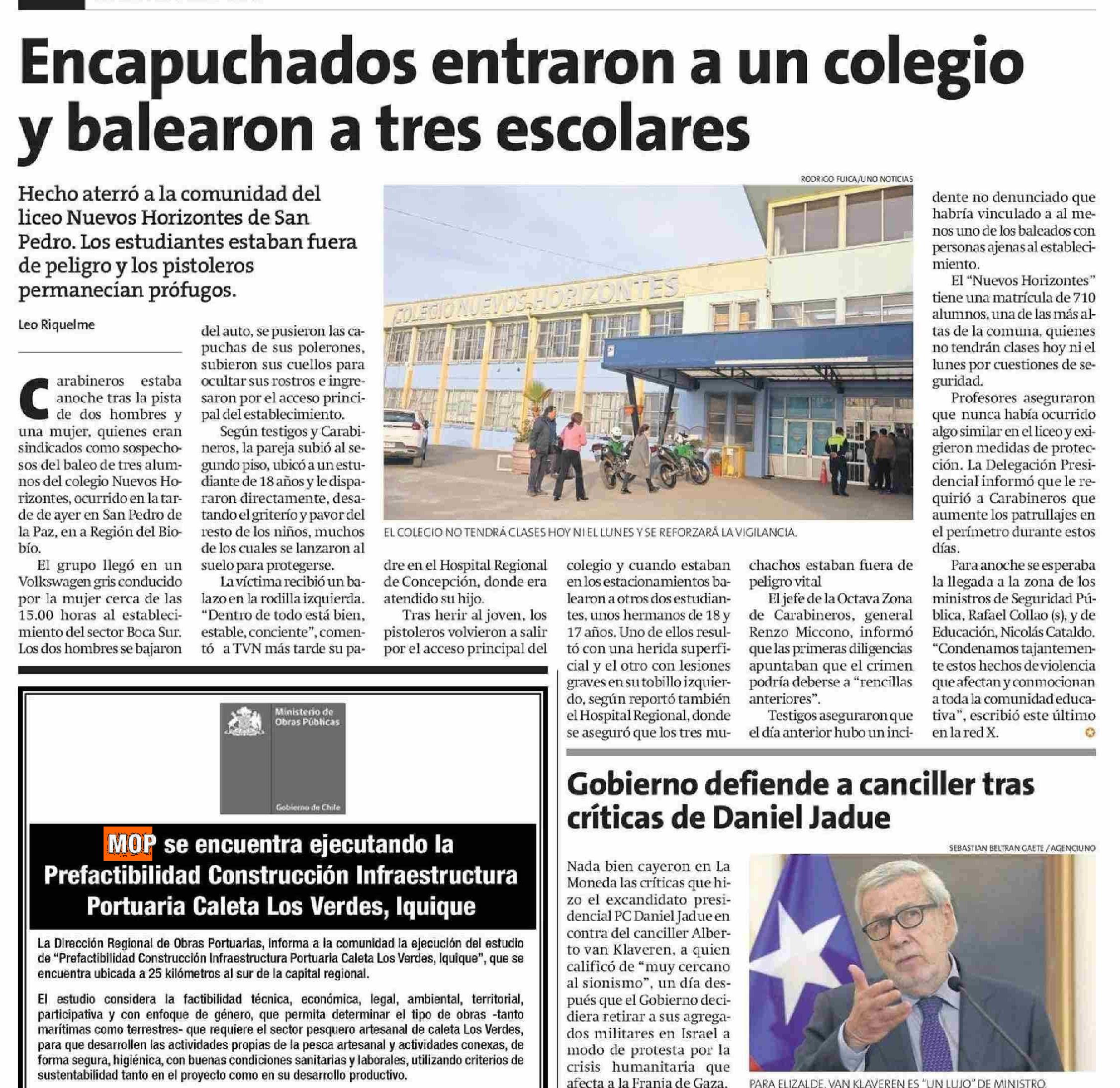 Encapuchados entraron a un colegio y balearon a tres escolares 30-05-2025 La Estrella de Iquique |