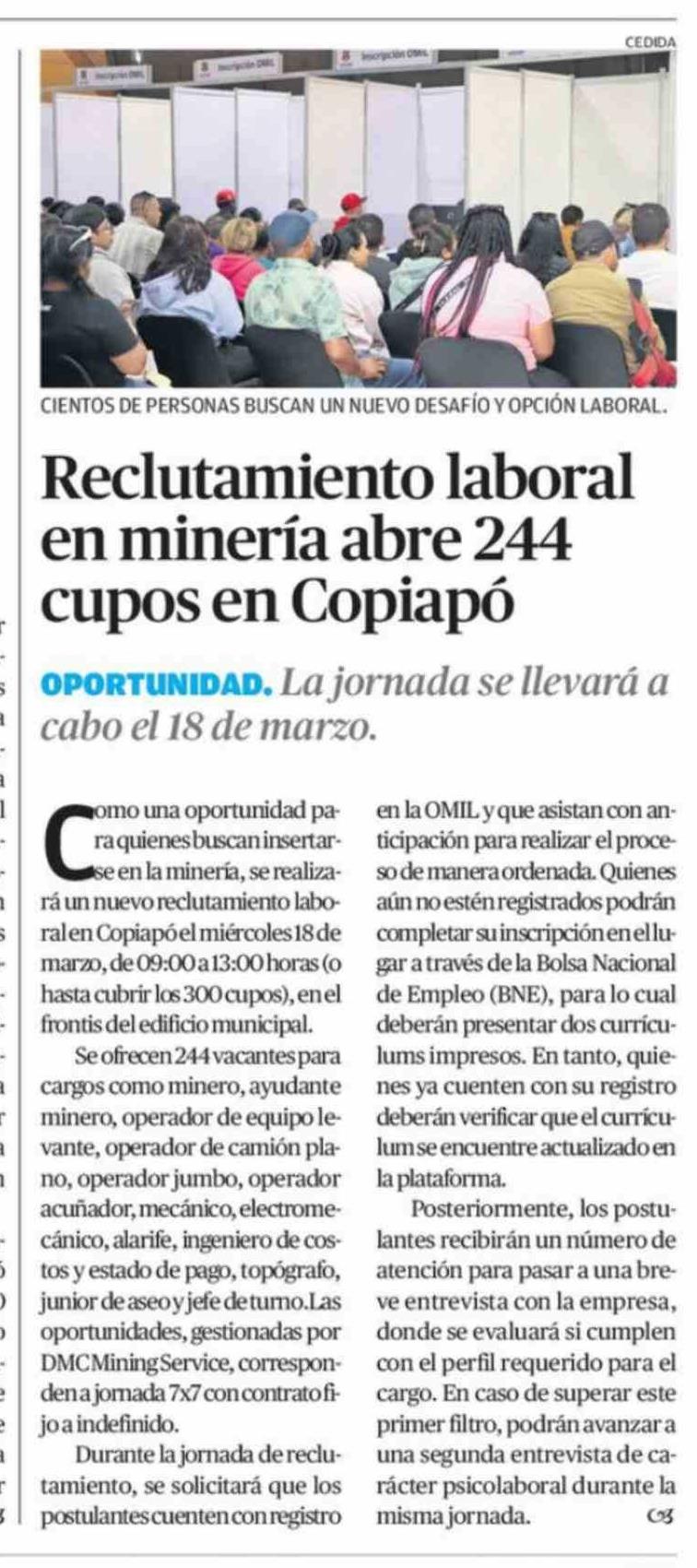 Título: Reclutamiento laboral en minería abre 244 cupos en Copiapó