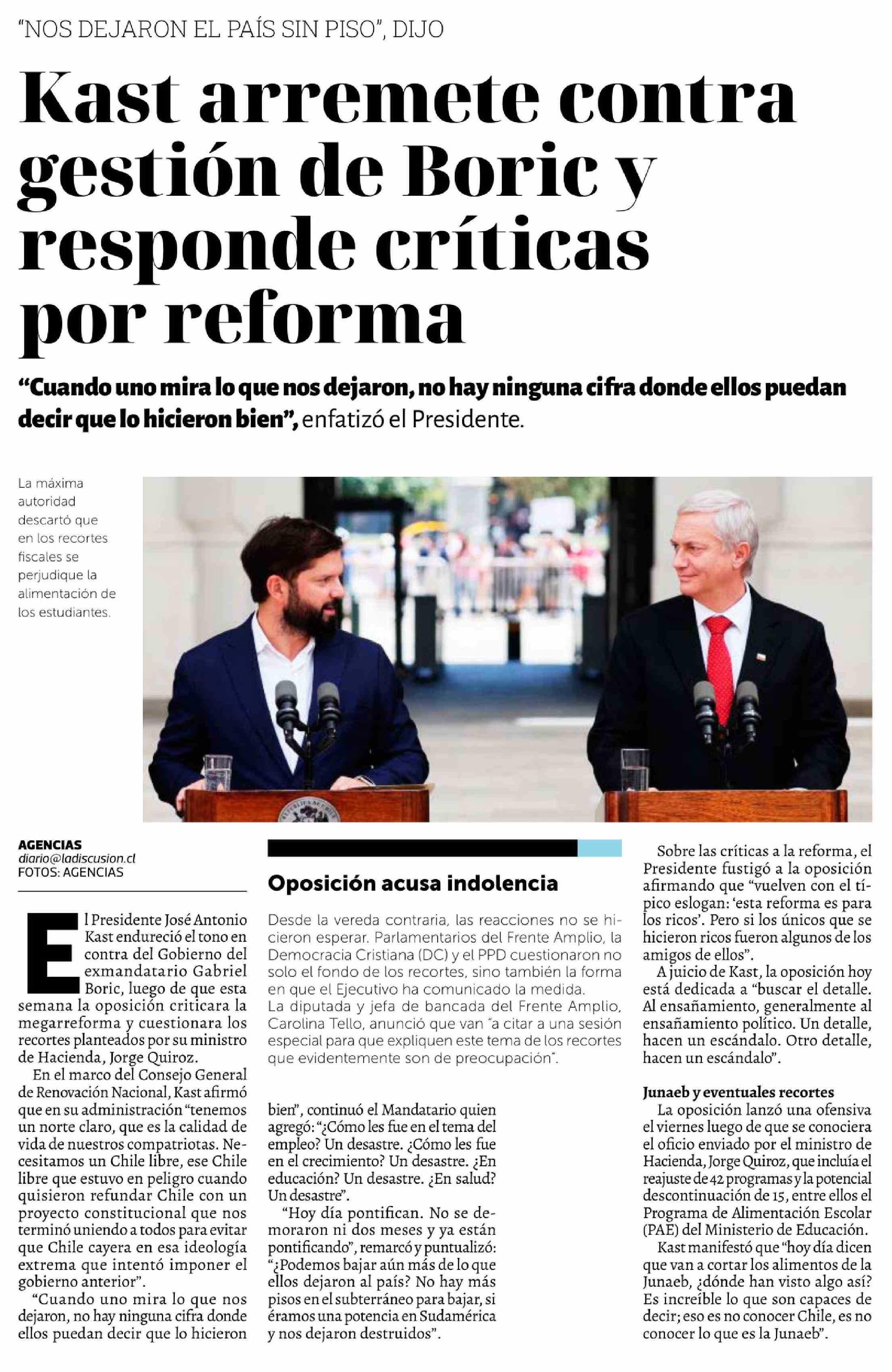Título: Kast arremete contra gestión de Boric y responde críticas por reforma