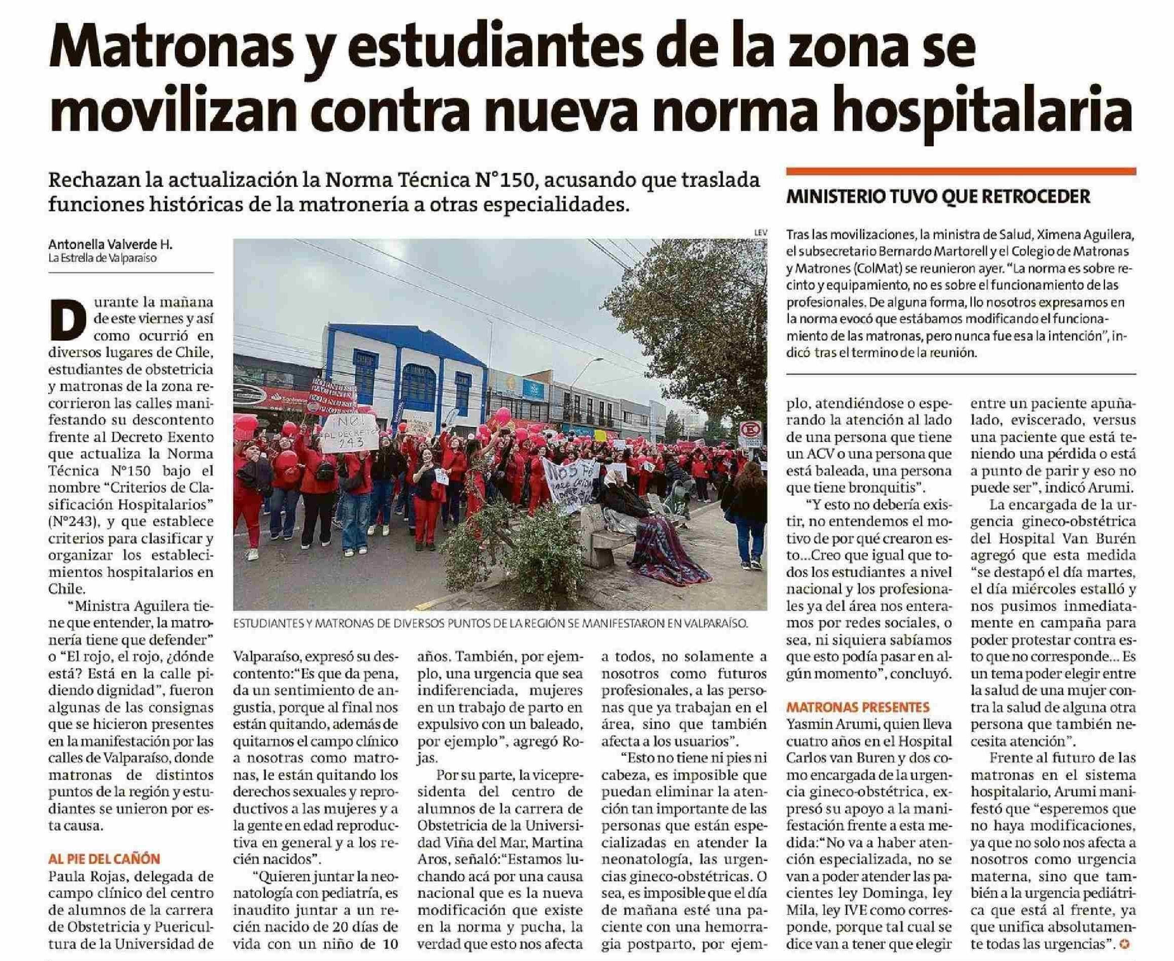 Matronas y estudiantes de la zona se movilizan contra nueva norma hospitalaria 24-05-2025 La Estrella de Valparaíso |
