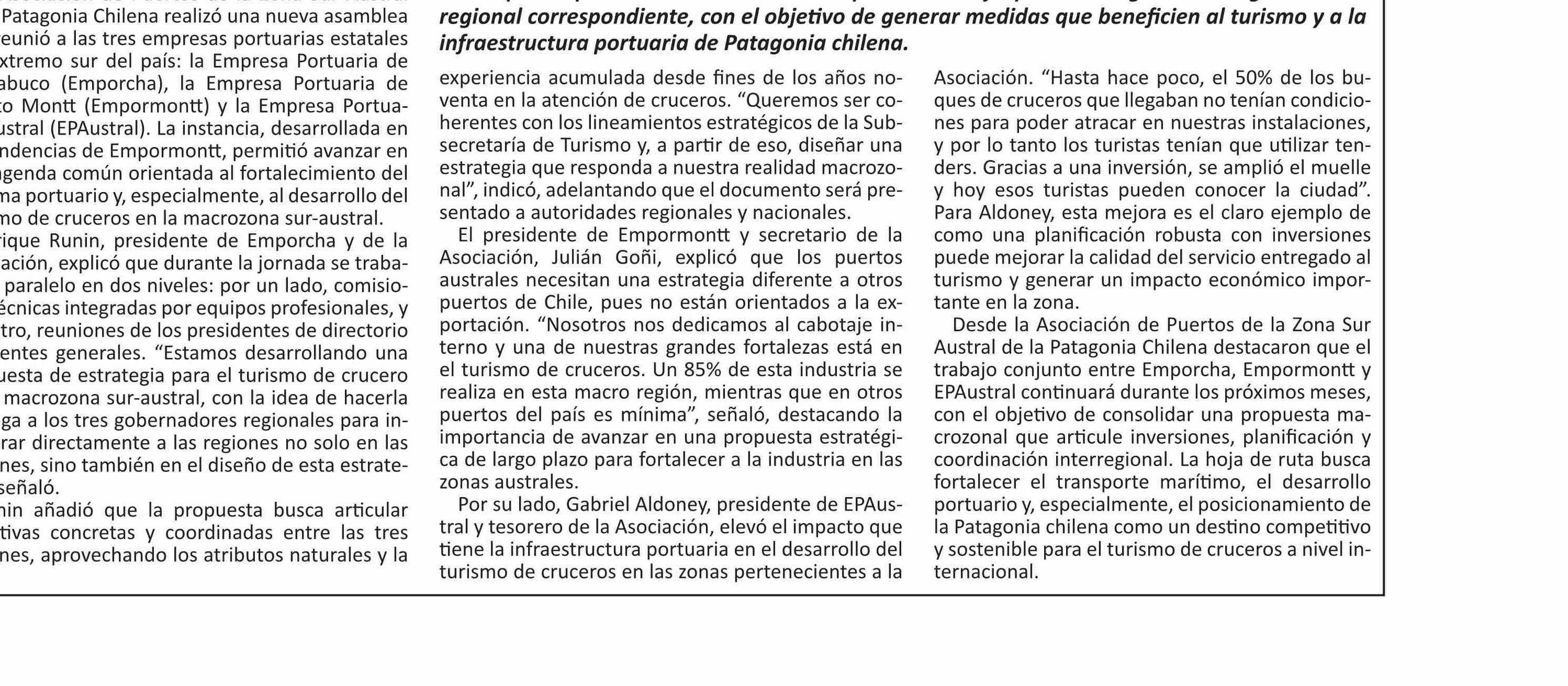| Título: | Asociación de Puertos Australes avanza en hoja de ruta macrozonal para el desarrollo portuario y turístico |