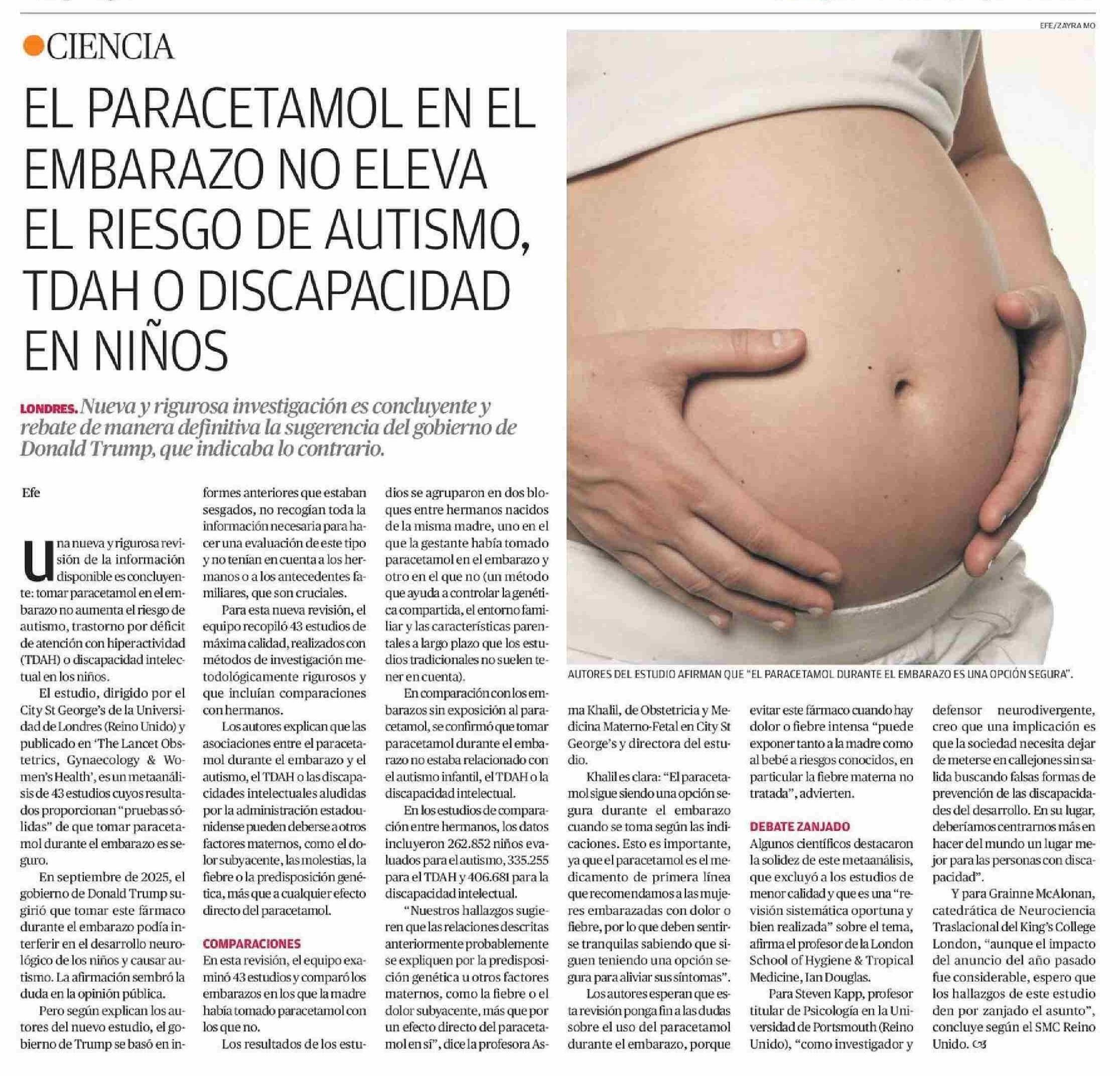 EL PARACETAMOL EN EL EMBARAZO NO ELEVA EL RIESGO DE AUTISMO, TDAH O DISCAPACIDAD EN NIÑOS 25-01-2026 Diario Austral Región de Los Ríos |