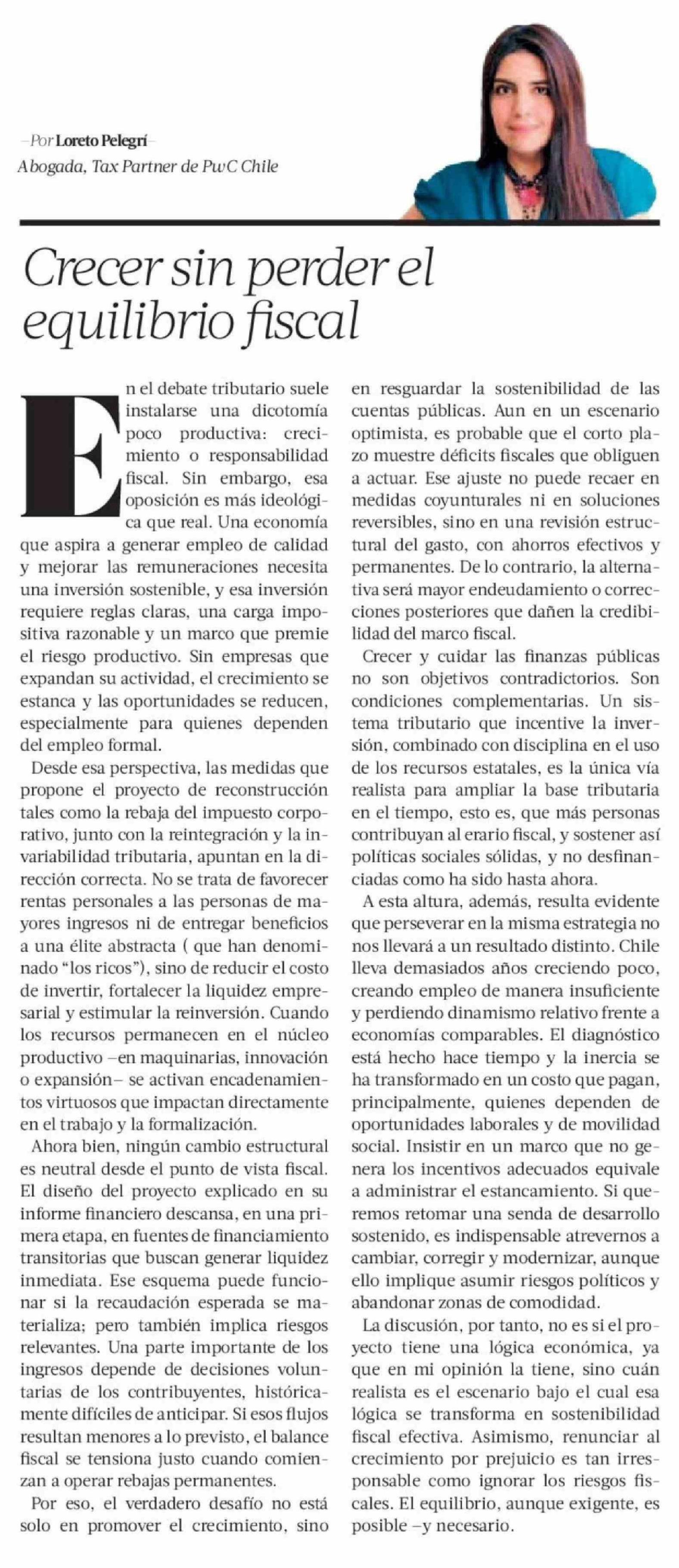 Columnas de Opinión: Crecer sin perder el equilibrio fiscal 25-04-2026 La Tercera |