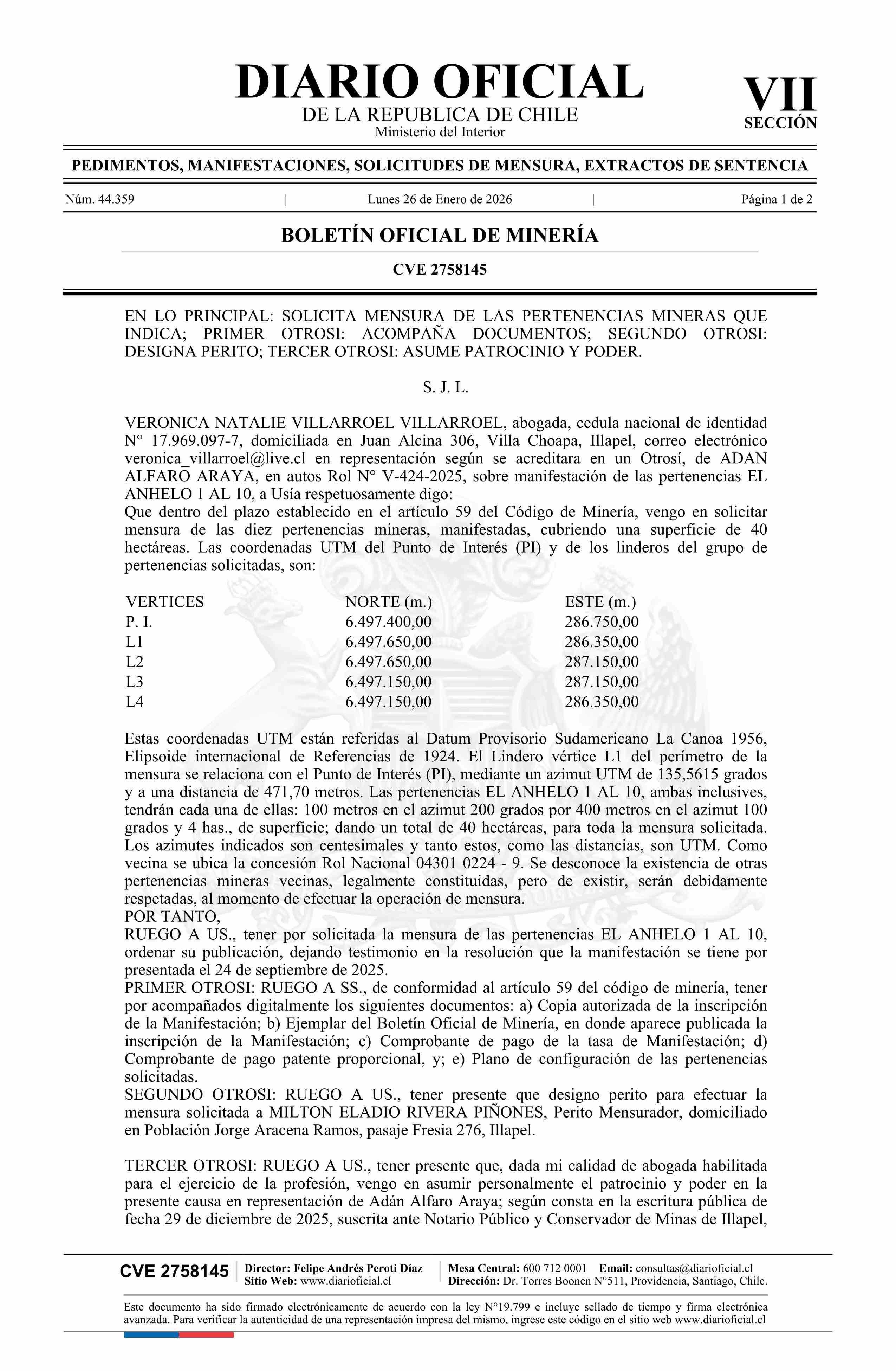 26-01-2026 DIARIO OFICIAL CHILE - BOLETÍN OFICIAL DE MINERÍA