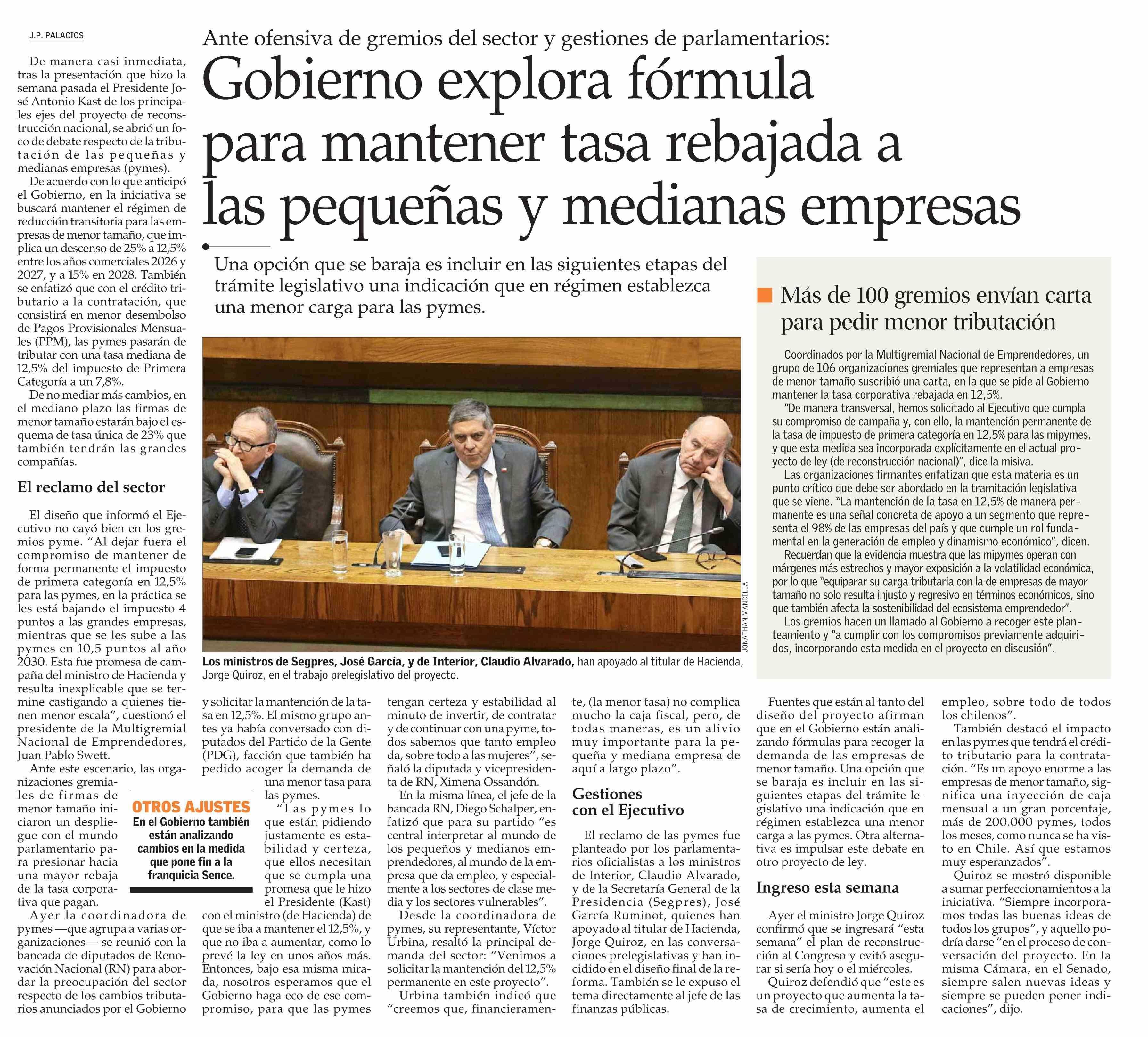 Gobierno explora fórmula para mantener tasa rebajada a las pequeñas y medianas empresas 21-04-2026 El Mercurio |