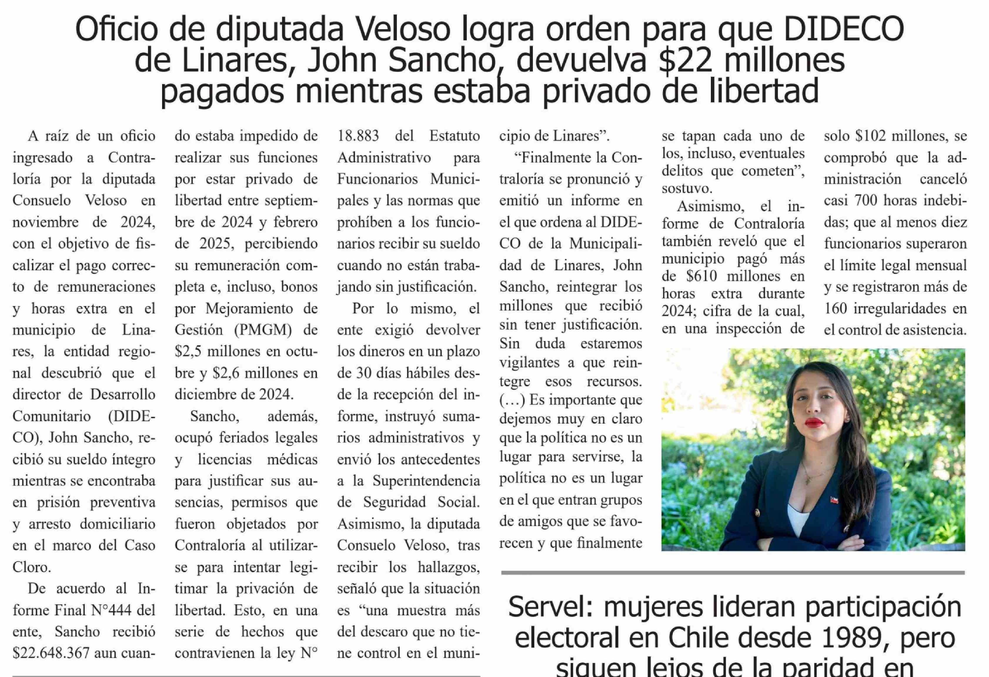 | Título: | Oficio de diputada Veloso logra orden para que DIDECO de Linares, John Sancho, devuelva $22 millones pagados mientras estaba privado de libertad |