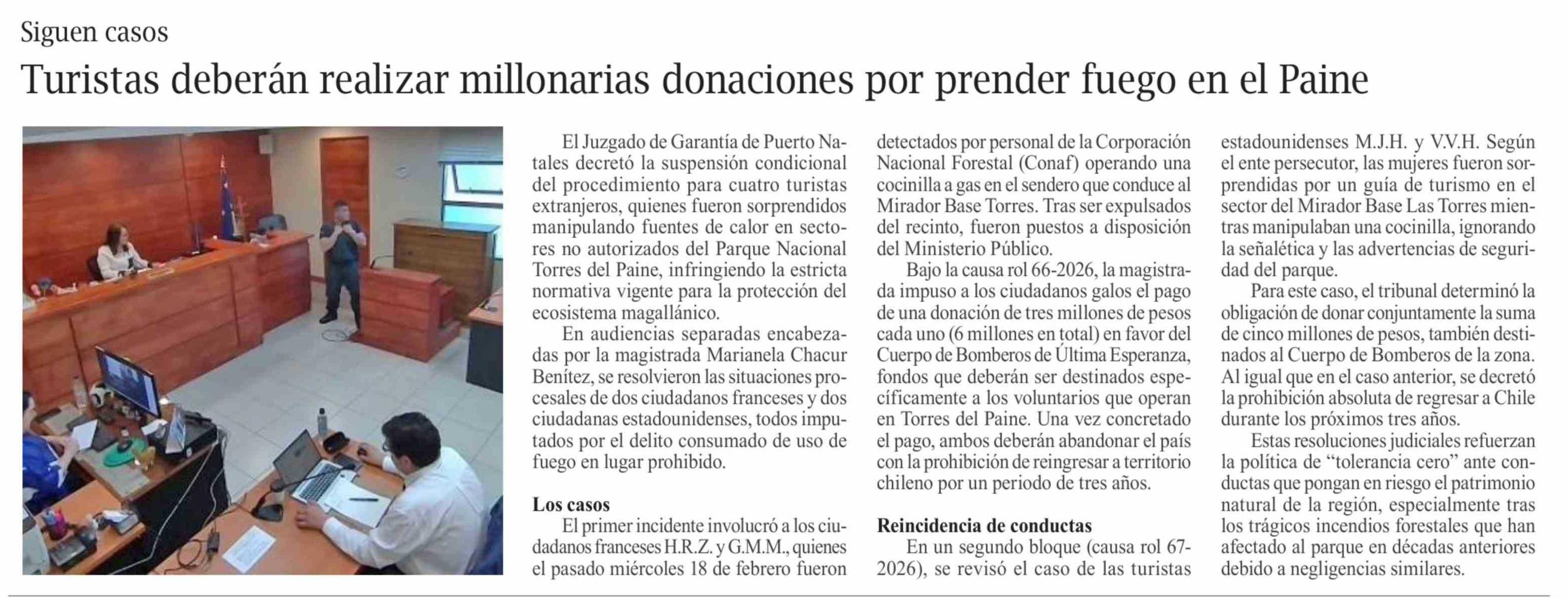 Turistas deberán realizar millonarias donaciones por prender fuego en el Paine 21-02-2026 El Pingüino |
