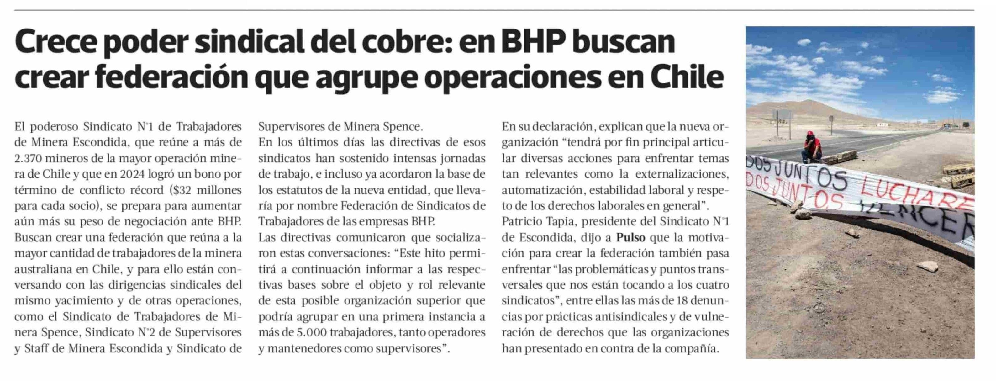 | Título: | Crece poder sindical del cobre: en BHP buscan crear federación que agrupe operaciones en Chile |