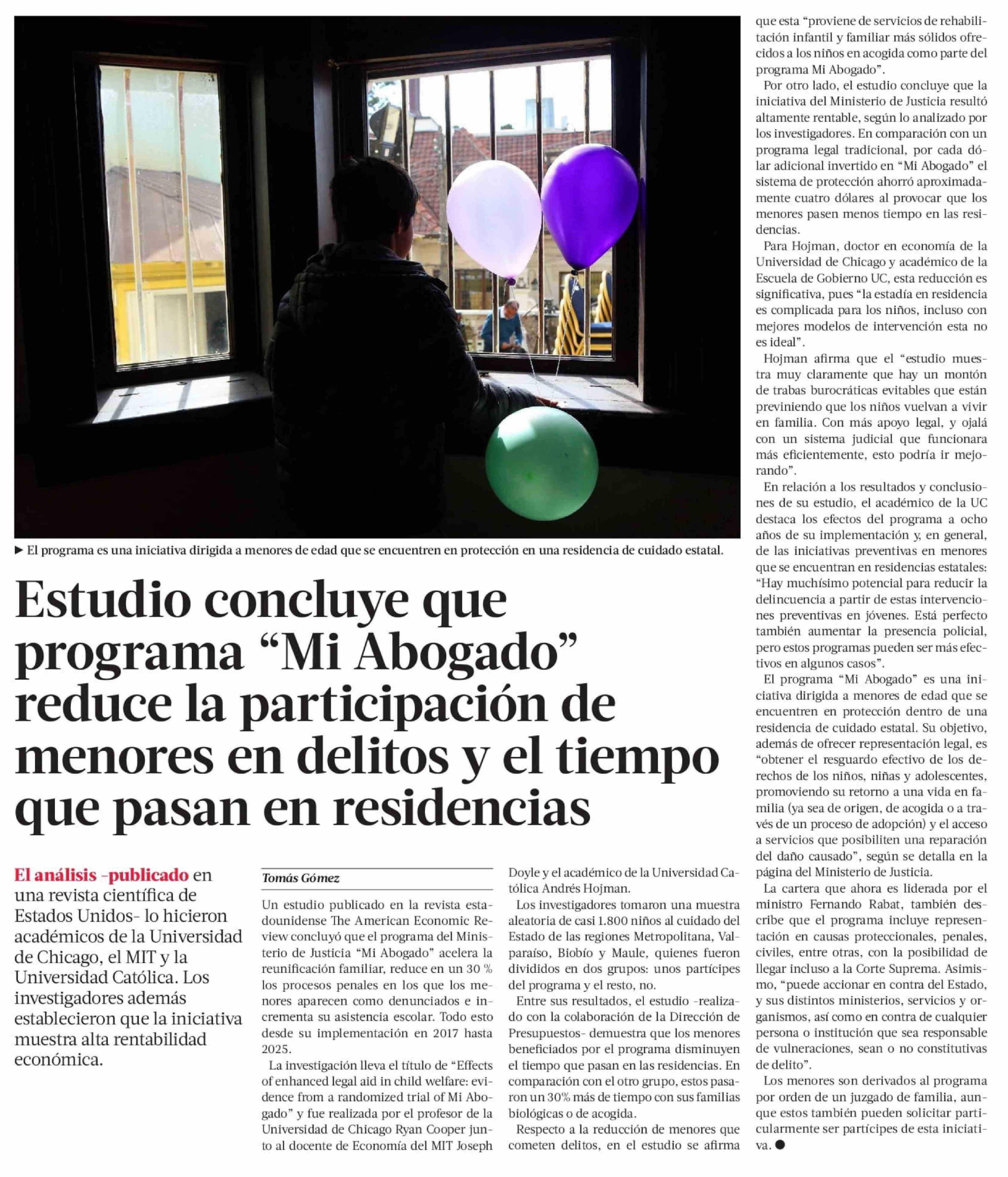 Estudio concluye que programa "Mi Abogado" reduce la participación de menores en delitos y el tiempo que pasan en residencias 18-03-2026 La Tercera |