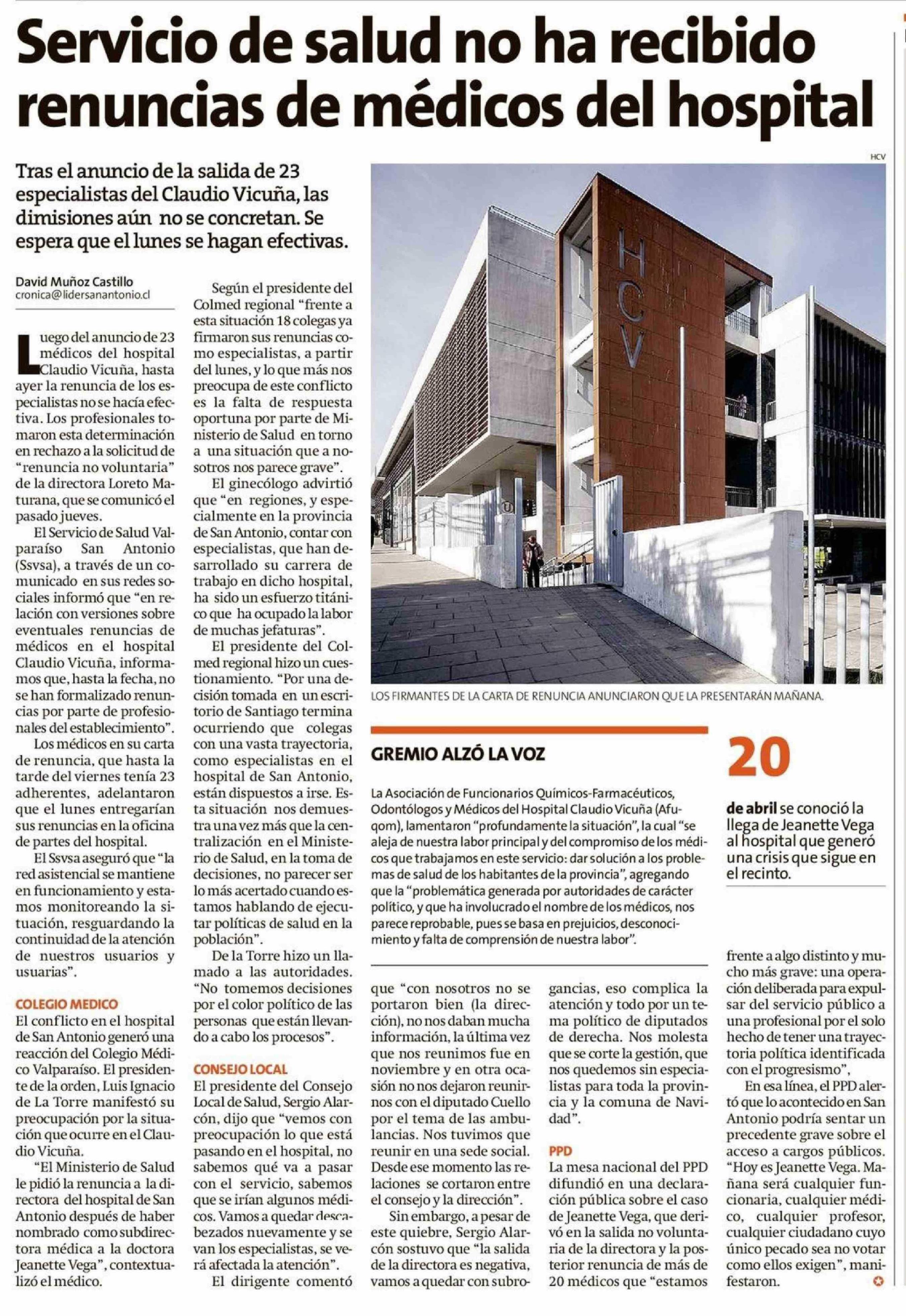 Título: Servicio de salud no ha recibido renuncias de médicos del hospital