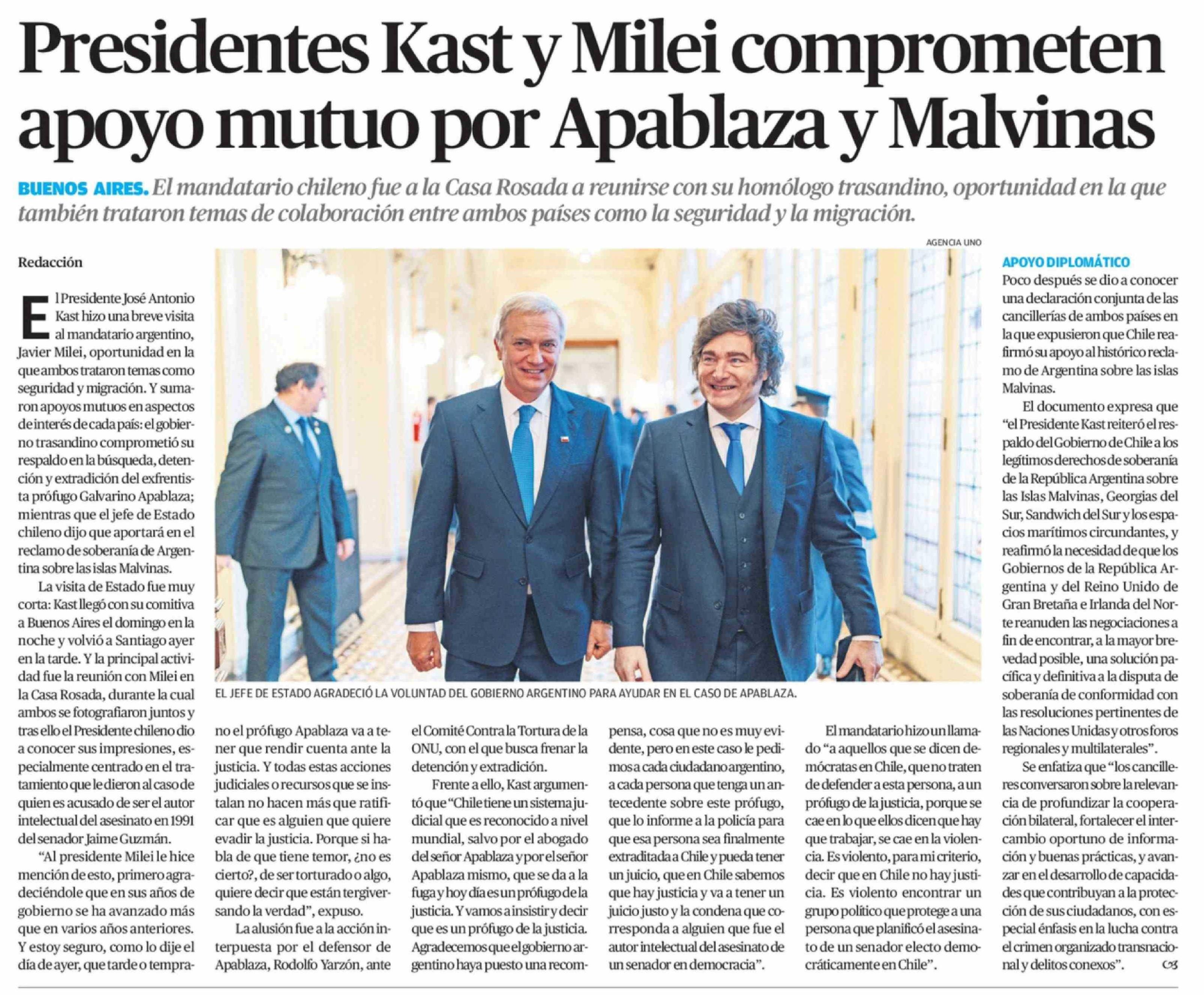 | Título: | Presidentes Kast y Milei comprometen apoyo mutuo por Apablaza y Malvinas |
