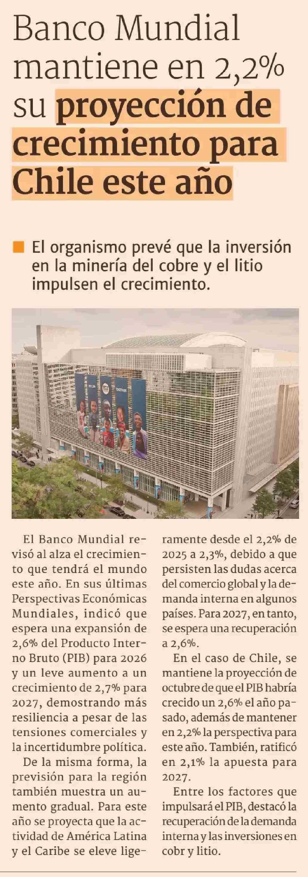 Título: Banco Mundial mantiene en 2,2% su proyección de crecimiento para Chile este año