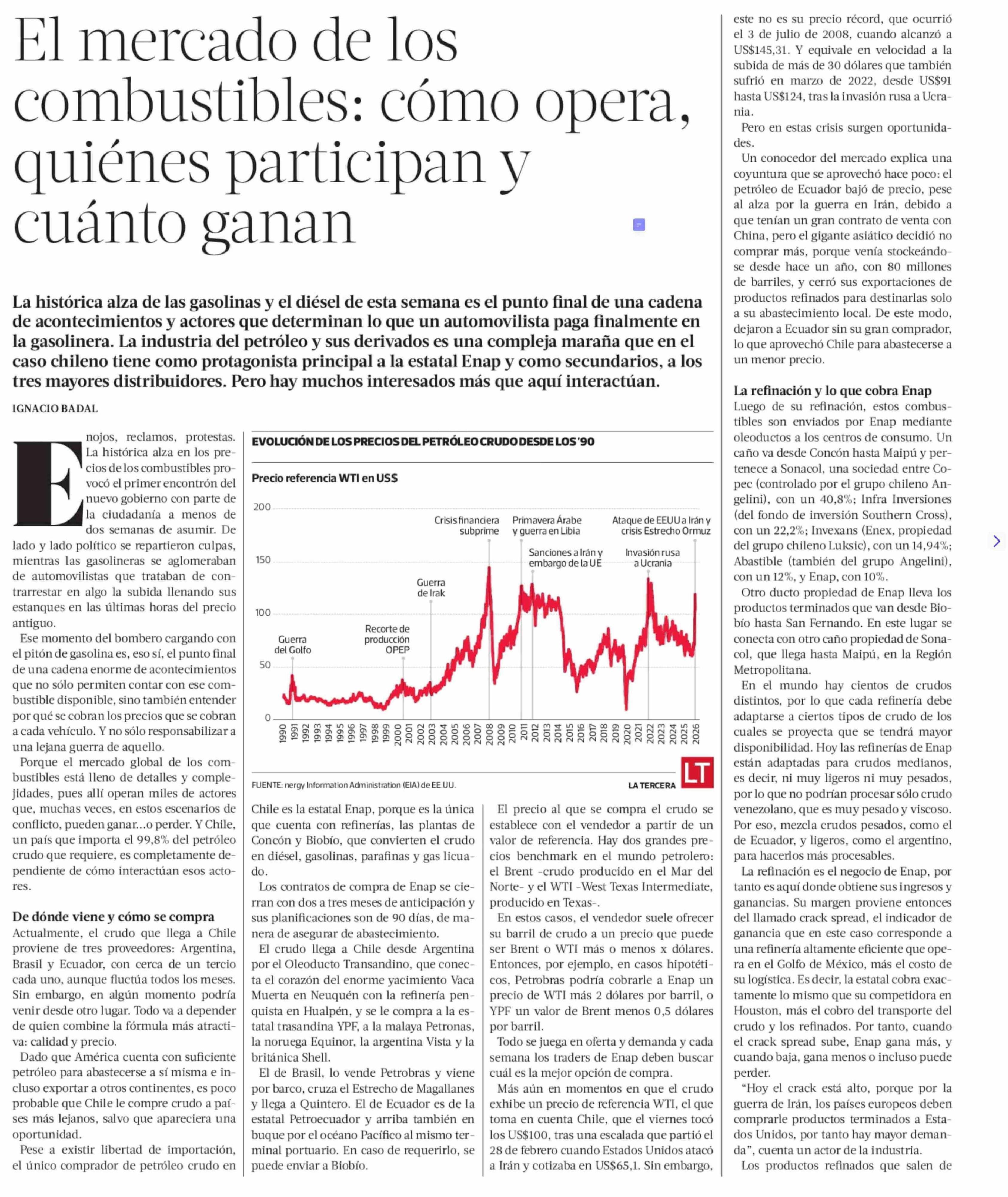 El mercado de los combustibles: cómo opera, quiénes participan y cuánto ganan 29-03-2026 La Tercera |