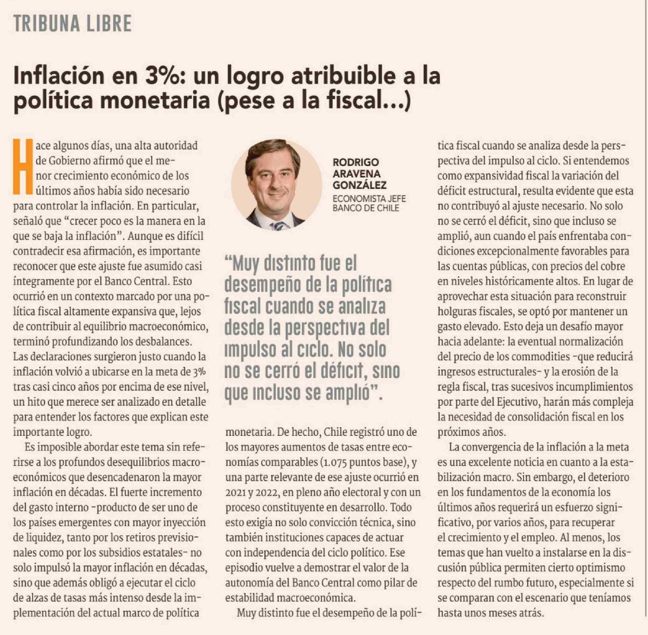 Título: Columnas de Opinión: Inflación en 3%: un logro atribuible a la política monetaria (pese a la fiscal ... )