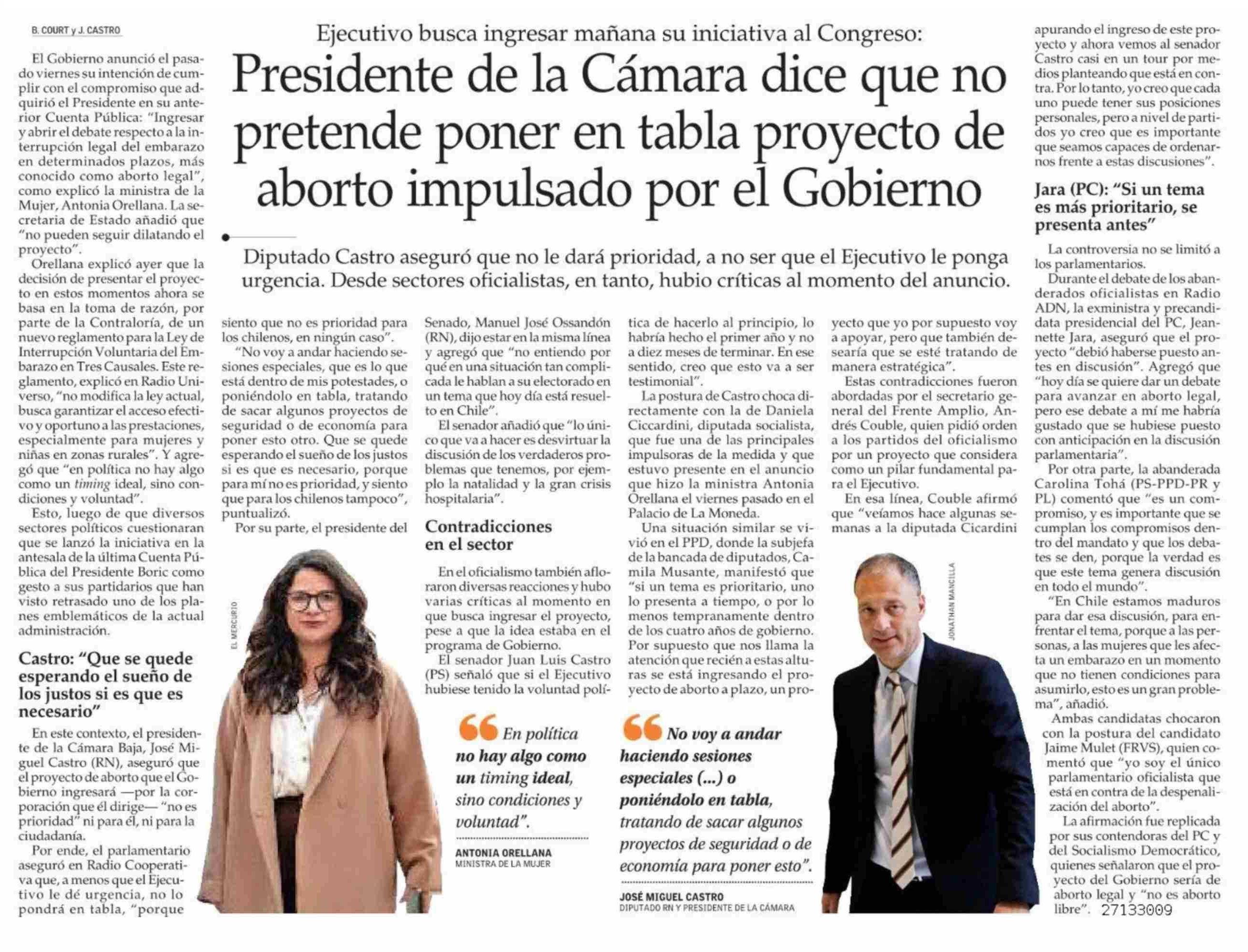 Presidente de la Cámara dice que no pretende poner en tabla proyecto de aborto impulsado por el Gobierno 27-05-2025 El Mercurio |