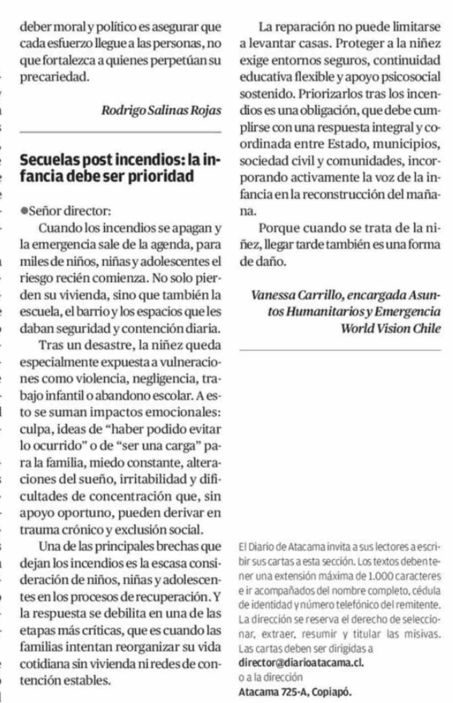 Secuelas post incendios: la infancia debe ser prioridad 19-02-2026 El Diario de Atacama |