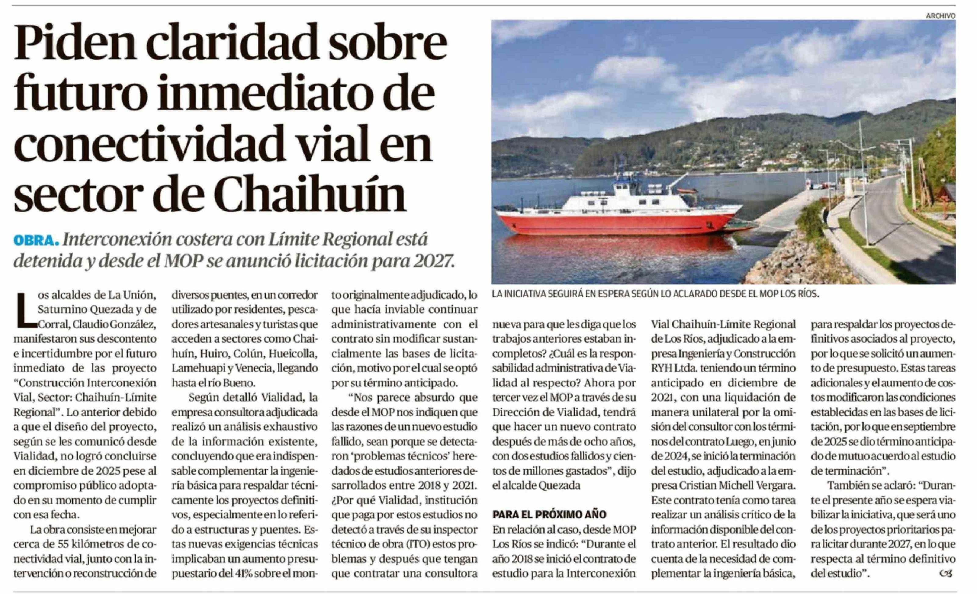 | Título: | Piden claridad sobre futuro inmediato de conectividad vial en sector de Chaihuín |