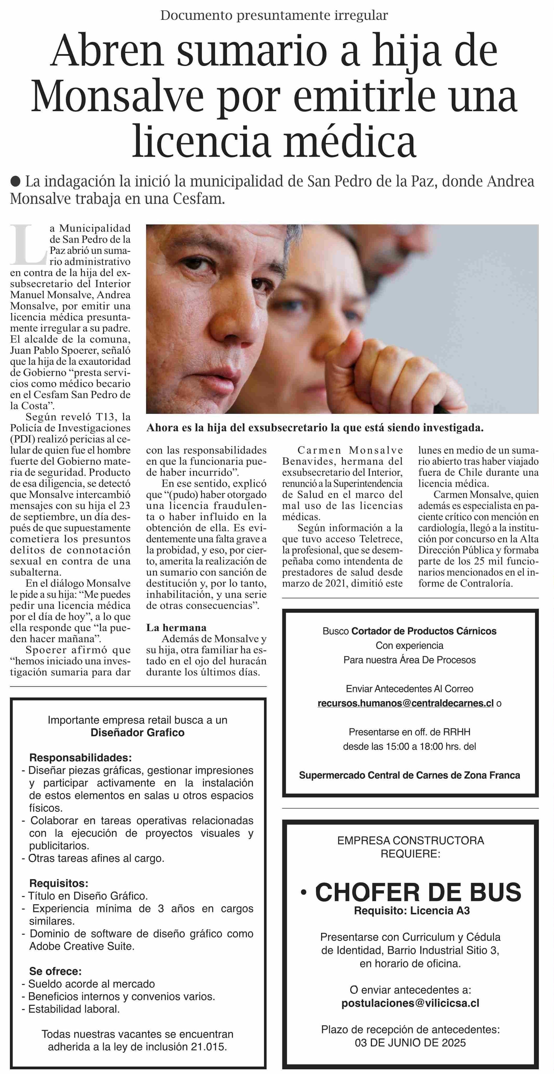 Abren sumario a hija de Monsalve por emitirle una licencia médica 30-05-2025 El Pingüino |