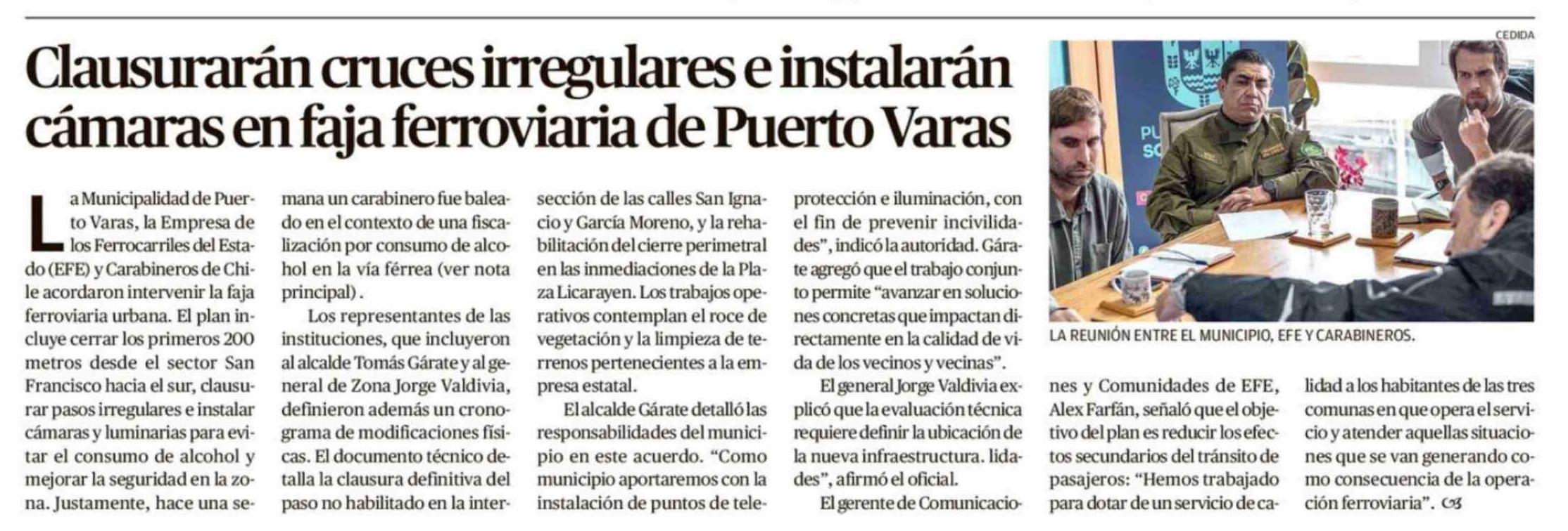 Clausurarán cruces irregulares e instalarán cámaras en faja ferroviaria de Puerto Varas 18-03-2026 El Llanquihue |