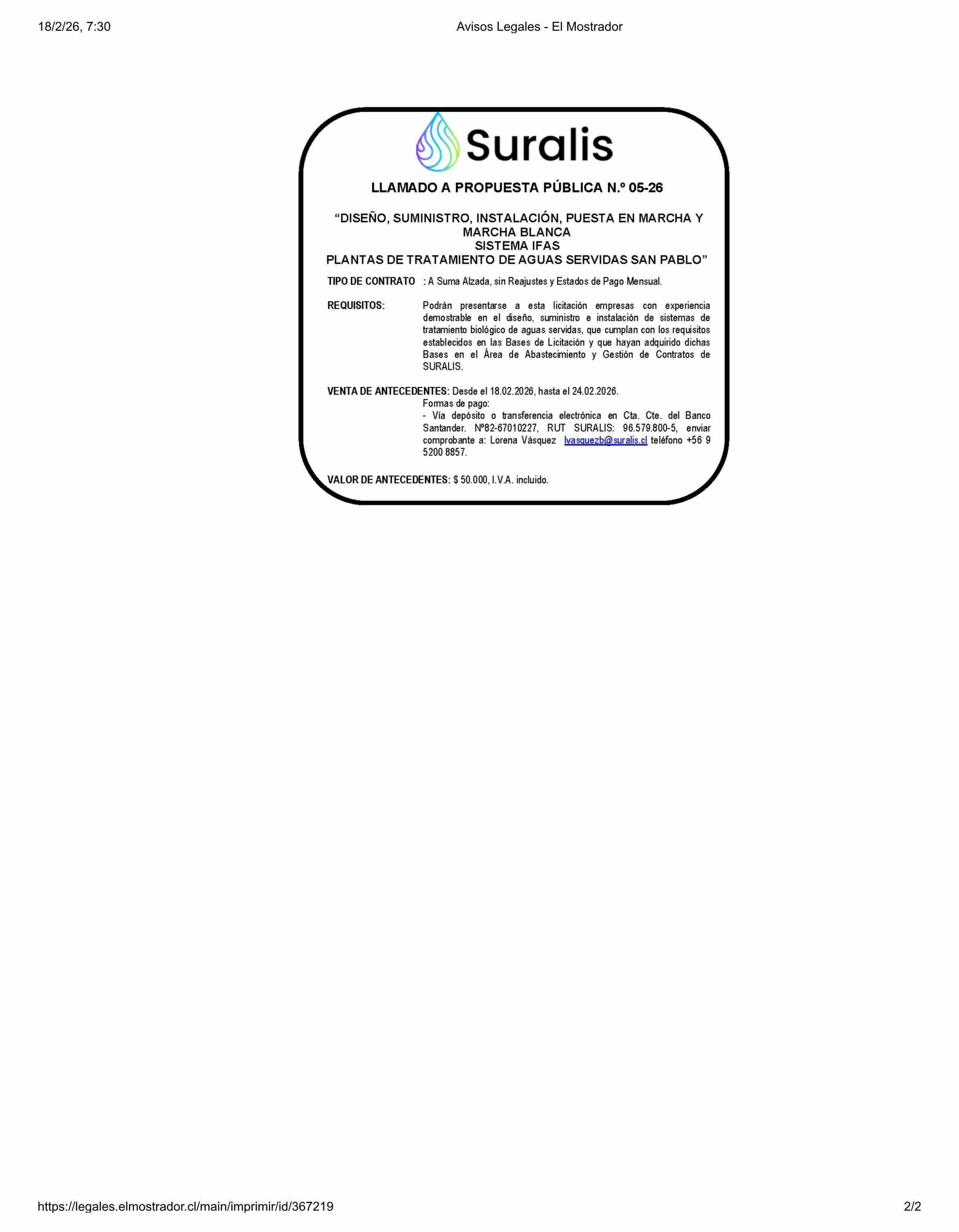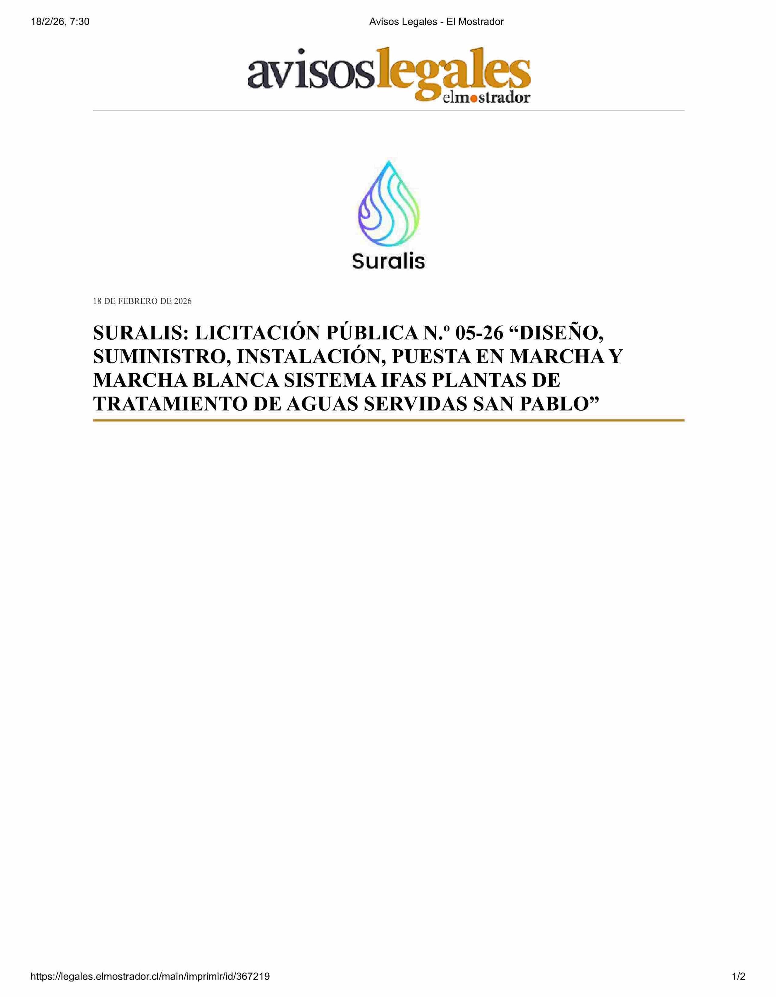 | Título: | AVISO LICITACIONES: SURALIS LICITACIÓN PÚBLICA N.” 05-26 “DISEÑO, SUMINISTRO, INSTALACIÓN, PUESTA EN MARCHA Y MARCHA BLANCA SISTEMA IFAS PLANTAS DE TRATAMIENTO DE AGUAS SERVIDAS SAN PABLO” |