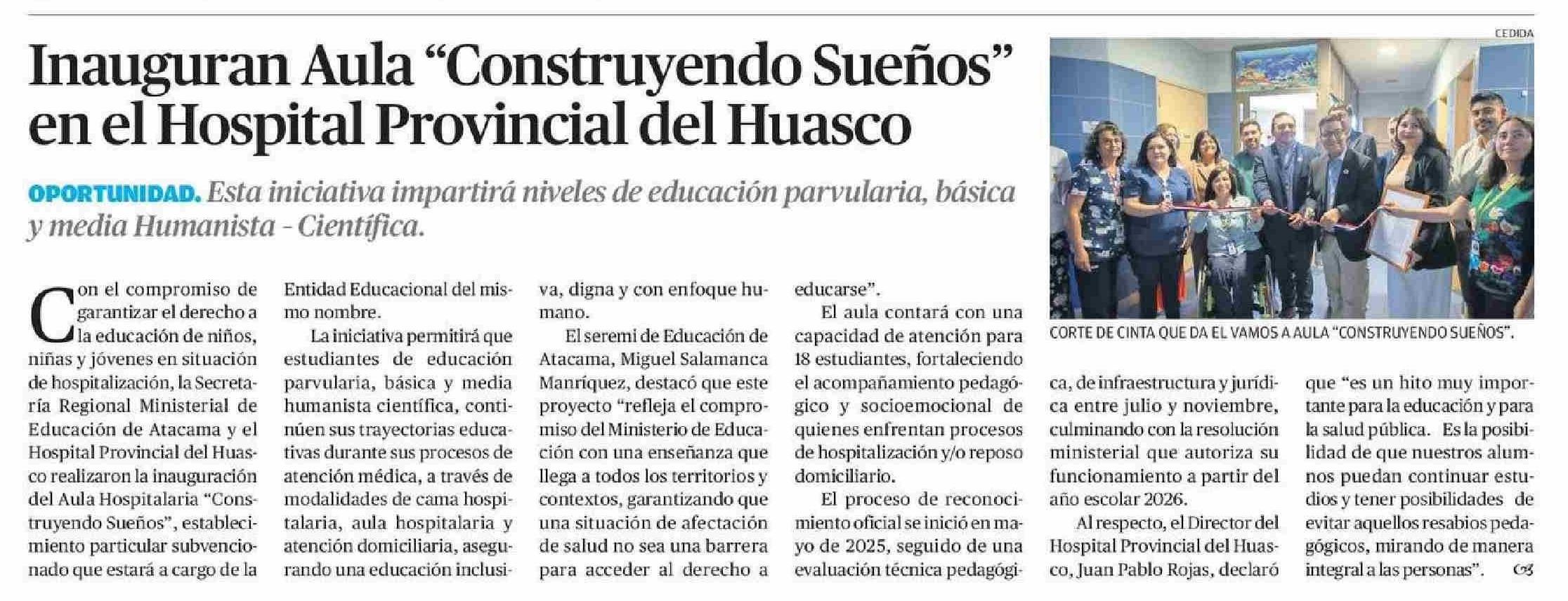 Inauguran Aula "Construyendo Sueños" en el Hospital Provincial del Huasco 19-01-2026 El Diario de Atacama |