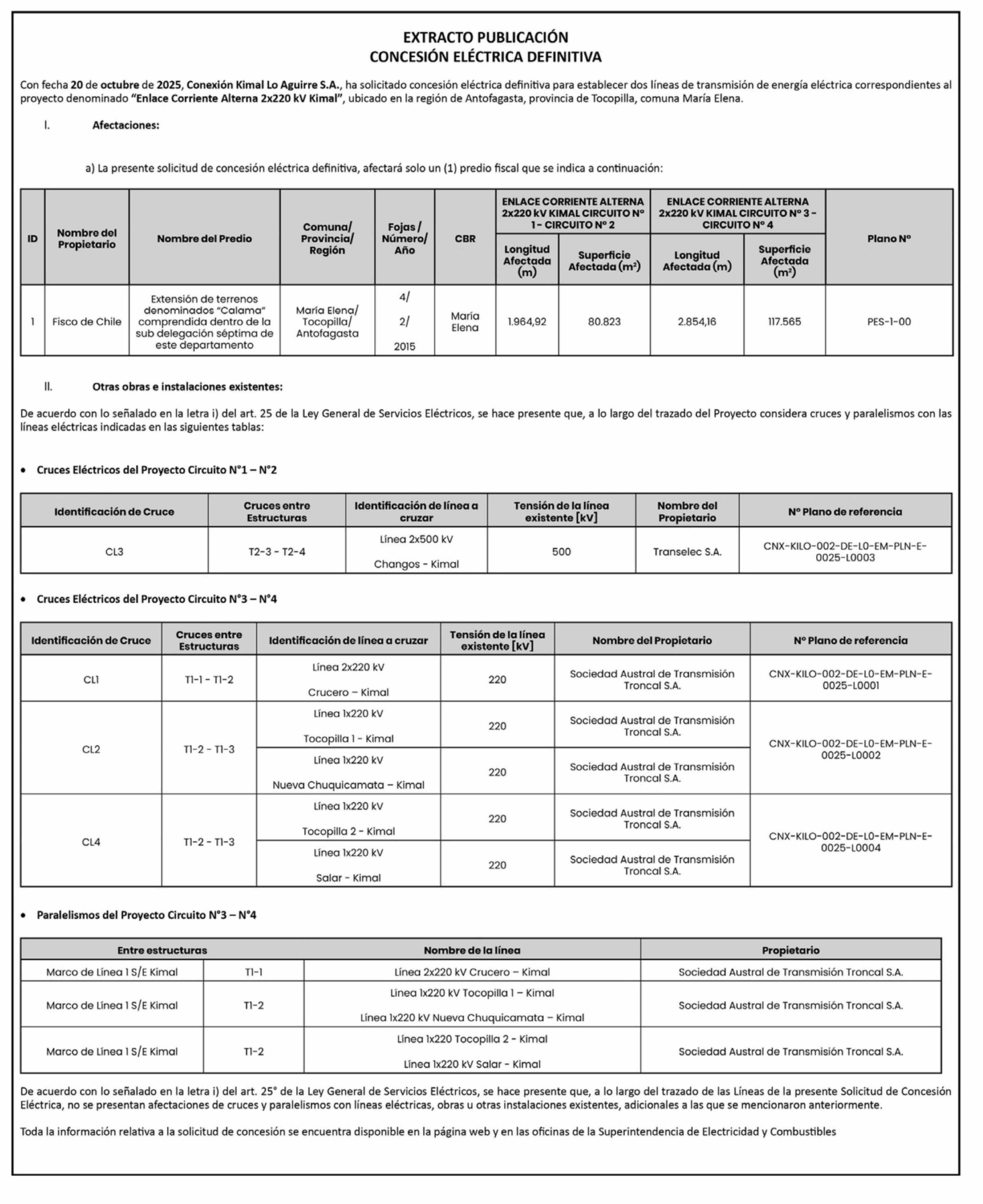 | Título: | Extractos: EXTRACTO PUBLICACIÓN CONCESIÓN ELÉCTRICA DEFINITIVA |