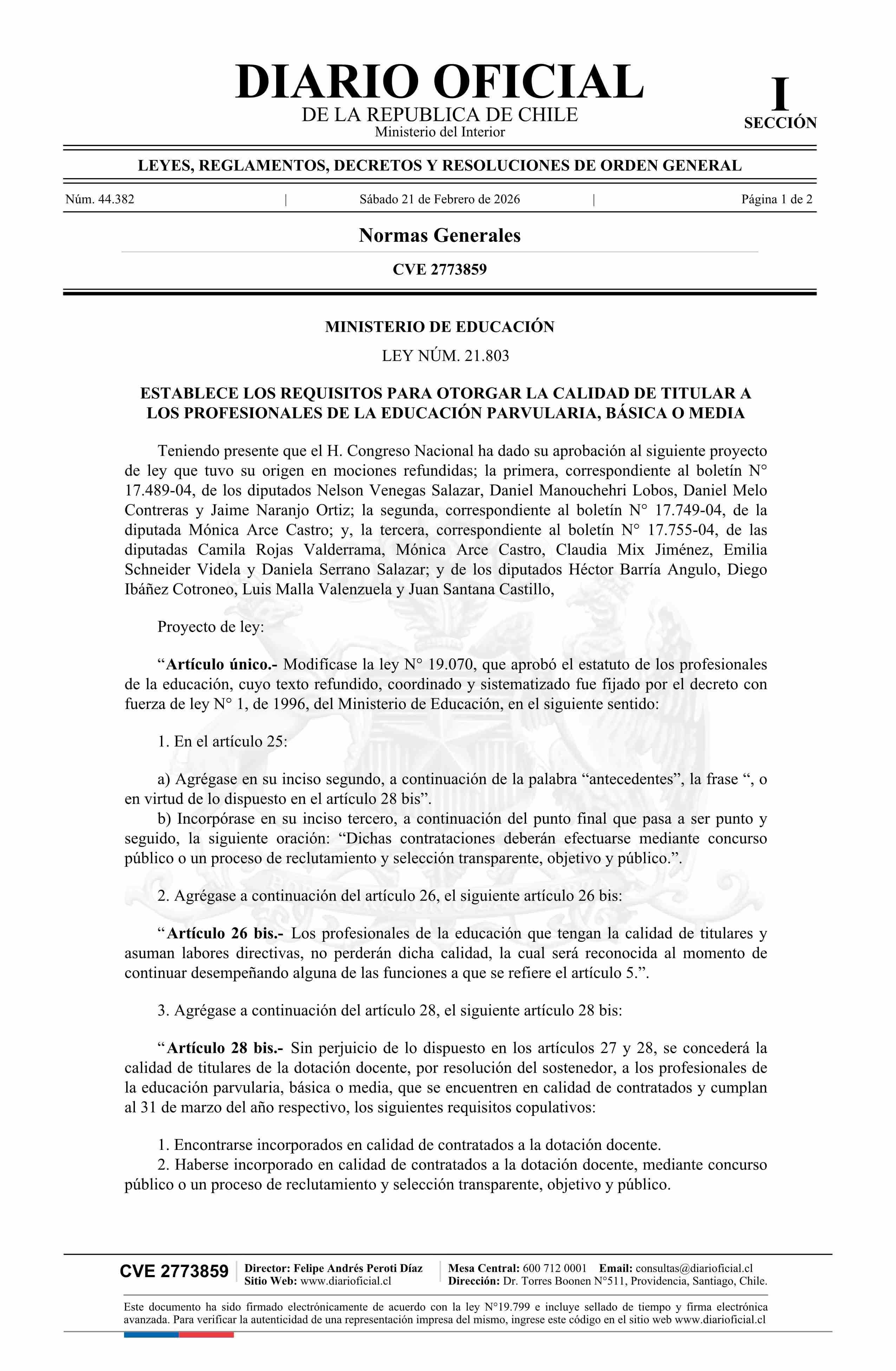 Título: Ley número 21.803.- Establece los requisitos para otorgar la calidad de titular a los profesionales de la educación parvularia, básica o media